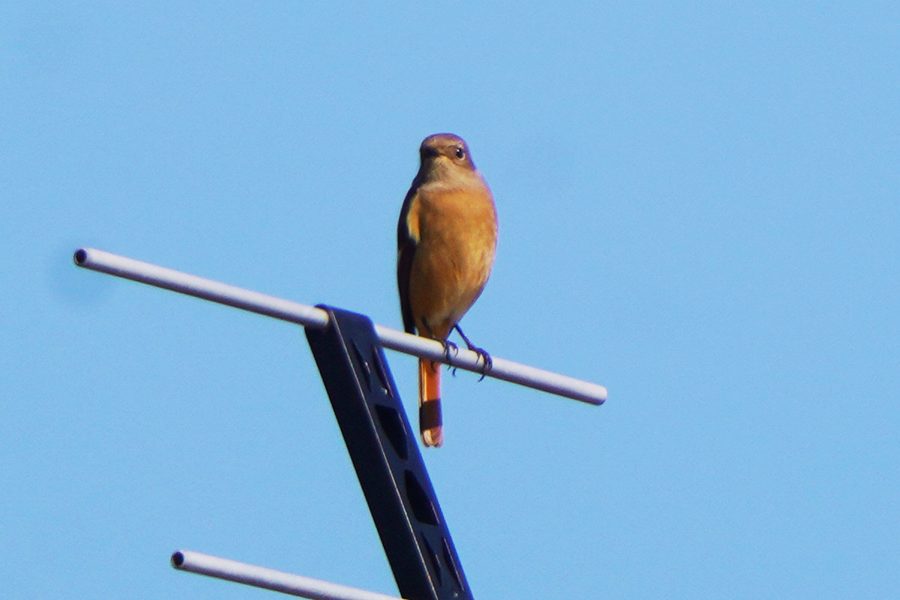 | ジョウビタキは毎年、10月末にやってきて冬の終わりまで自宅周辺で見られます。今年も数日前から「ヒッ ヒッ ヒッ」と鳴き声が聞こえるのですが、種瀬宅の近くには近づいてくれません。今日、ようやく遠く離れた家のテレビアンテナにとまっているジョウビタキ♀を撮ることができました。 |