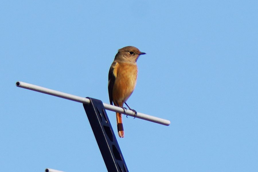 | しばらくすると別の鳥が飛んできてジョウビタキ♀は飛び去りました。変わってアンテナにとまったのはモズでした。 |