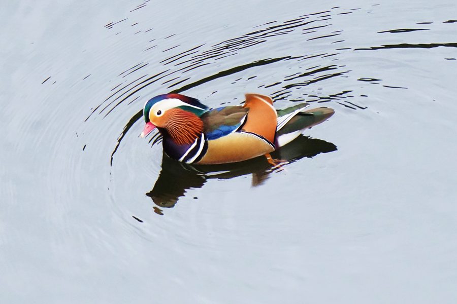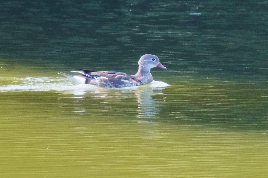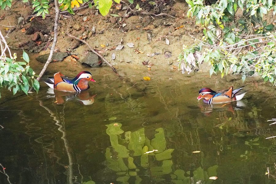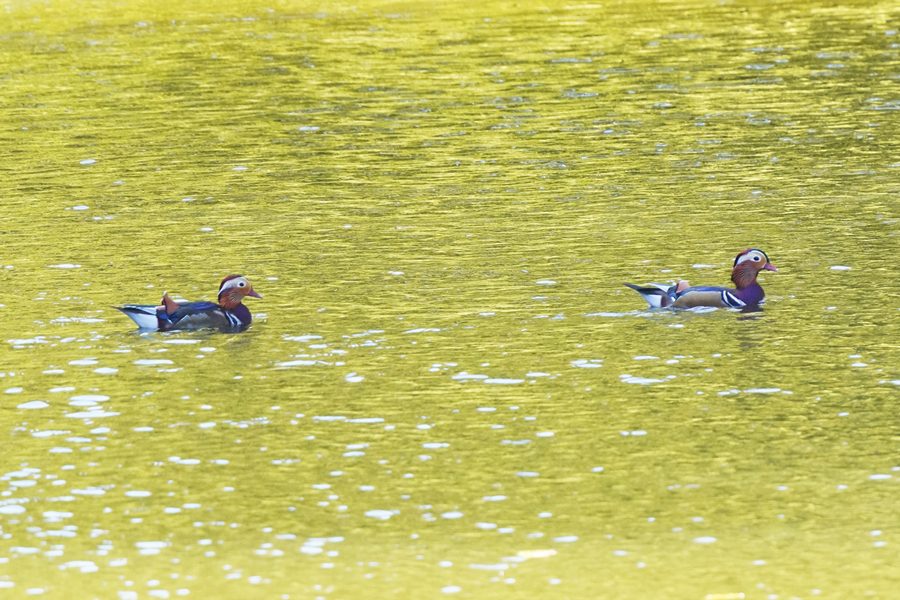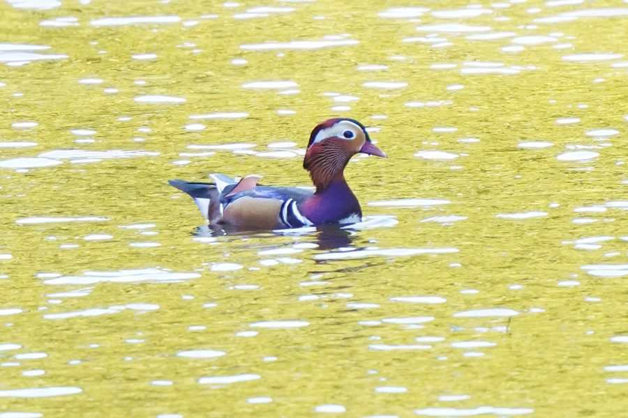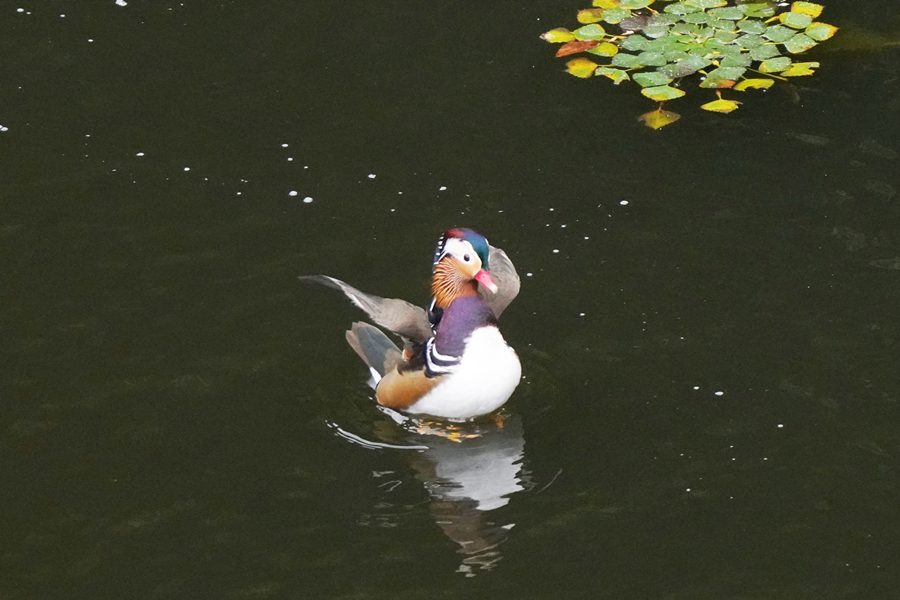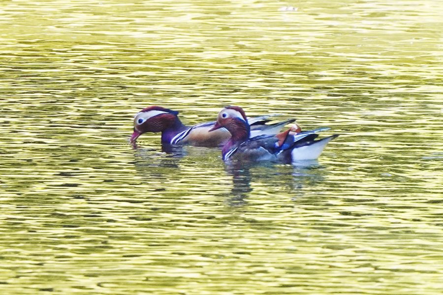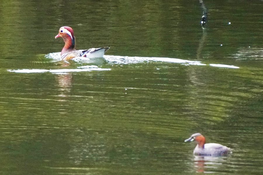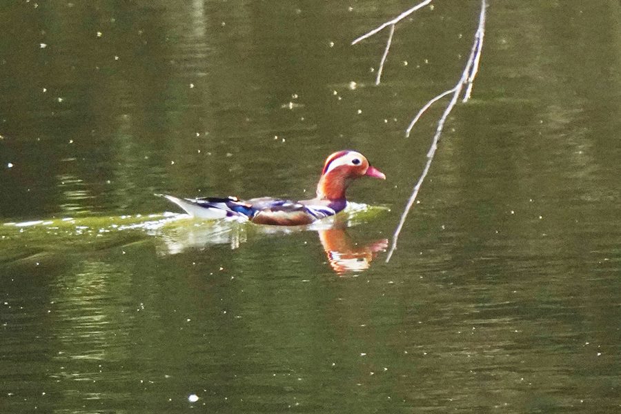 | 山の中のため池以外にも山の上の池にもオシドリがいました。山の中のため池に比べて近の明るい場所にオシドリがいて、ようやくまともなオシドリの写真になりました。 |