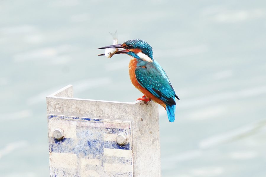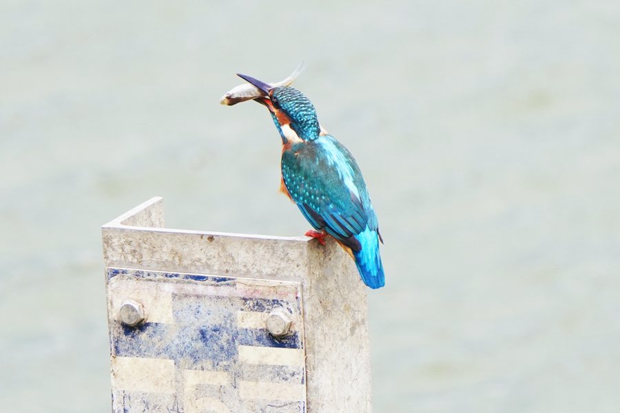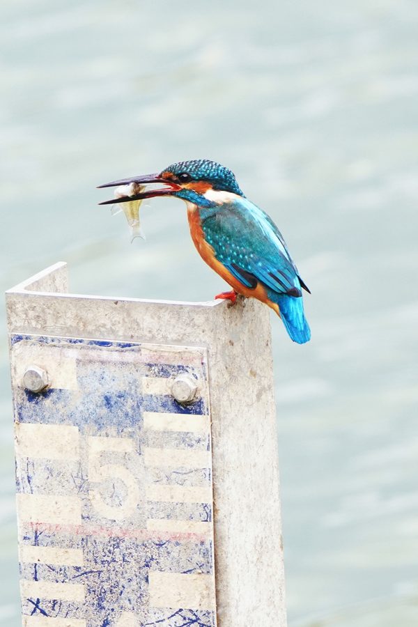 | 飛び込んだ後、水位測定ゲージの上に戻りました。小魚を咥えていました。この後、魚が少し大きいのか、なかなか吞み込めず、顔を回したりして悪戦苦闘していました。 |
