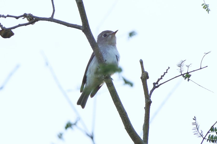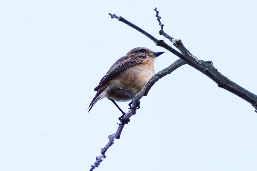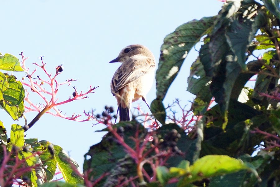 | 菊畑横の雑木林に数羽の鳥がいるのを見てカメラを向けました。空抜けの逆光で、撮影した後モニター画面で見るとノビタキのようです。 |
