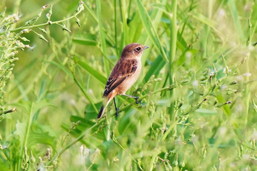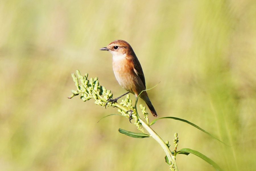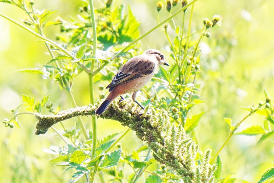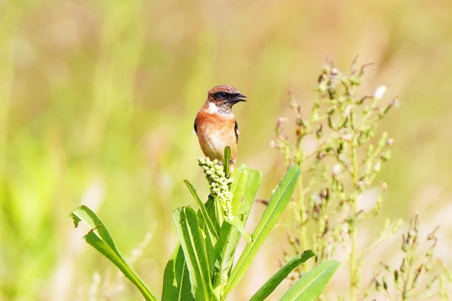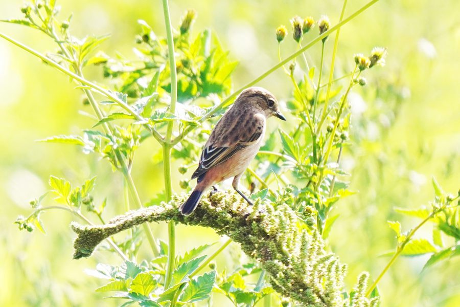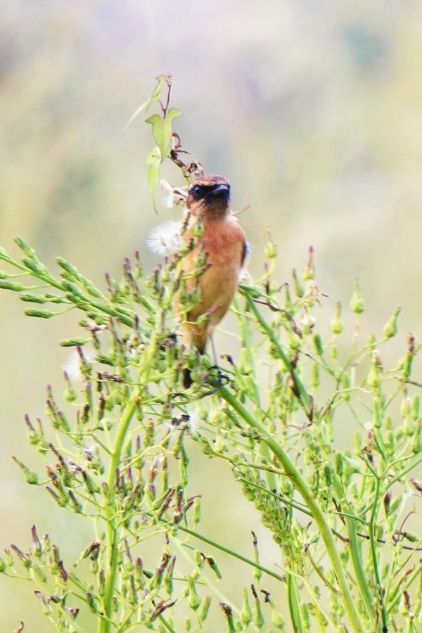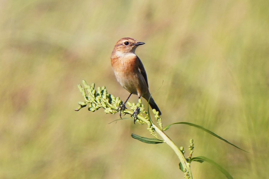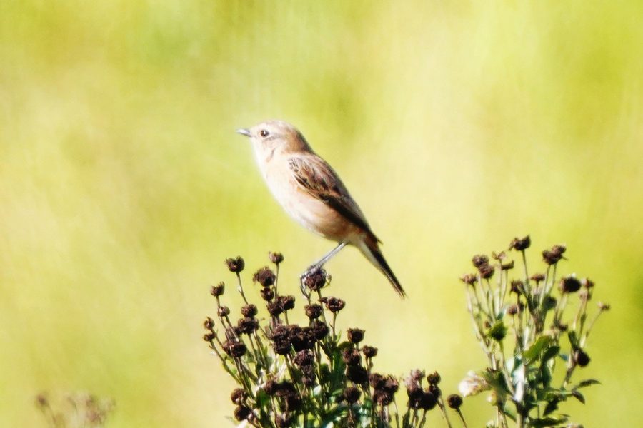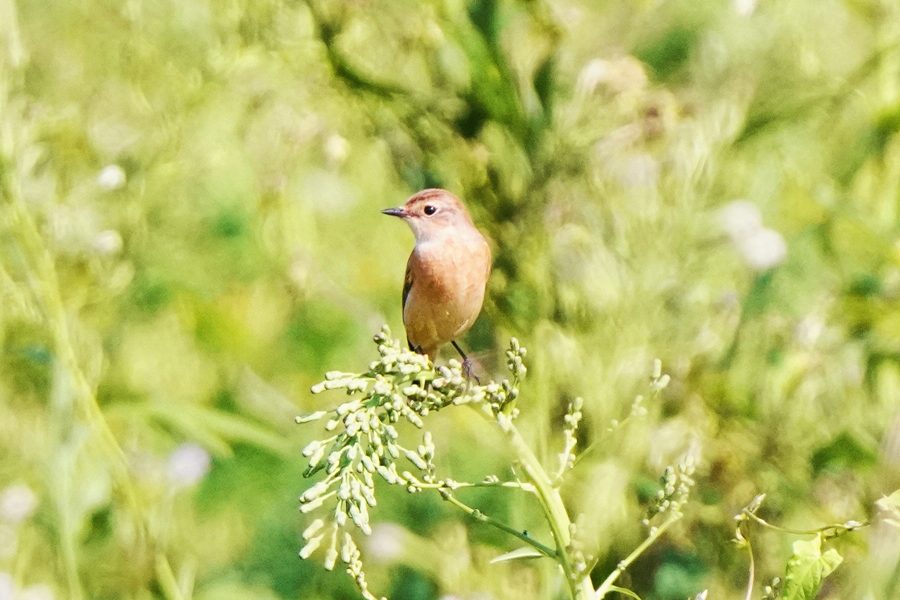 | この日も近くの水田地帯の広い耕作放棄地の草地でノビタキを撮影しました。あちこちにみられるオオアレチノギクやセイタカアワダチソウにとまっていて楽しませてくれました。 |