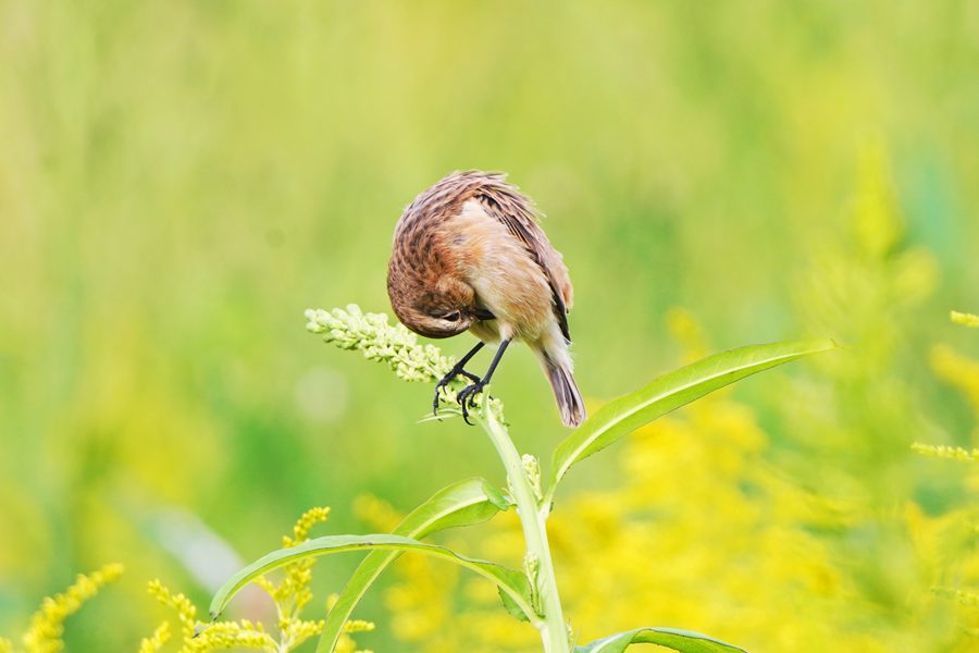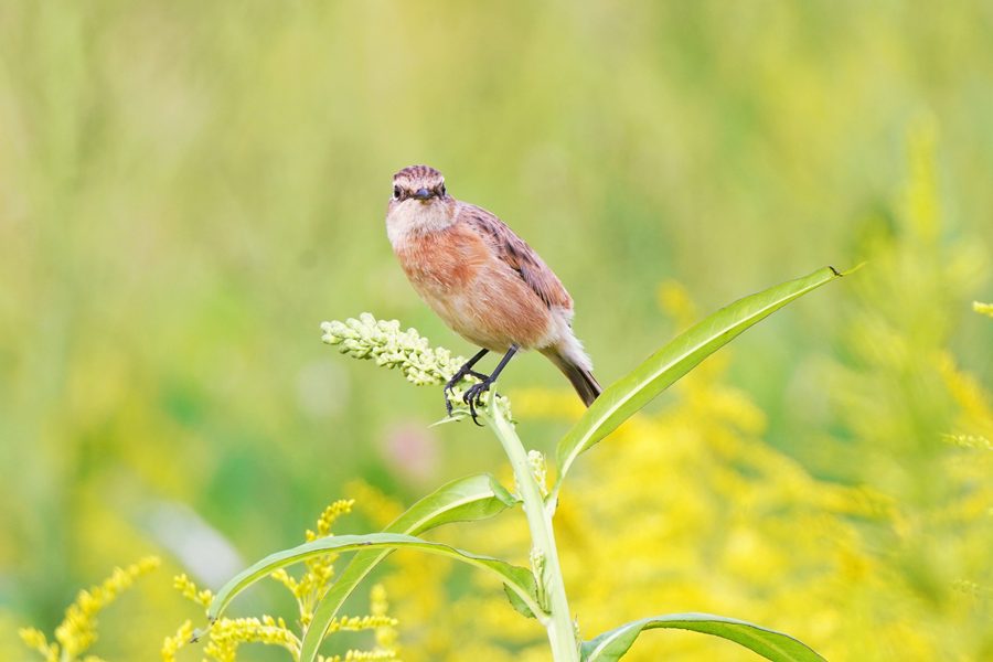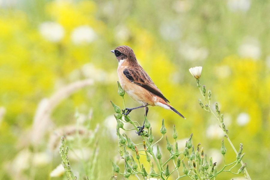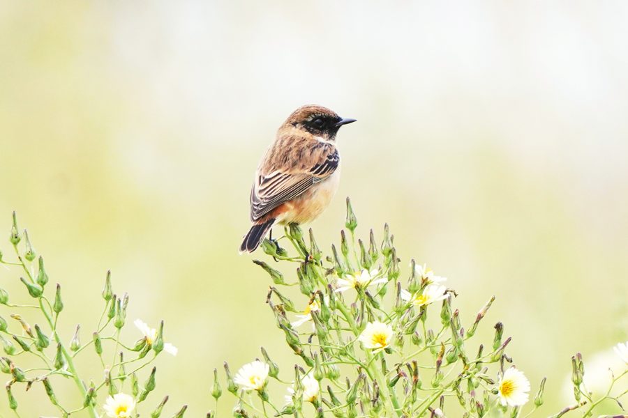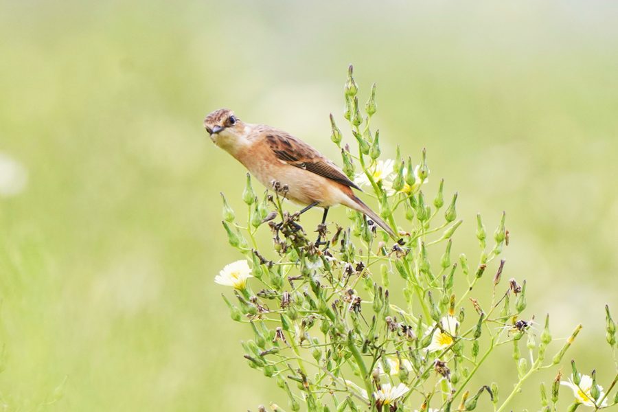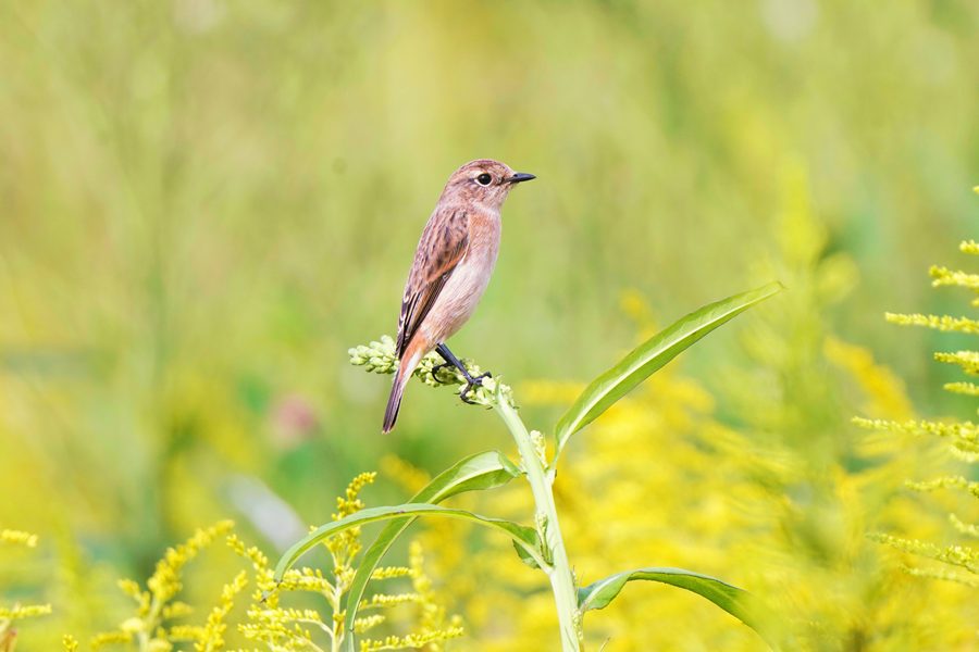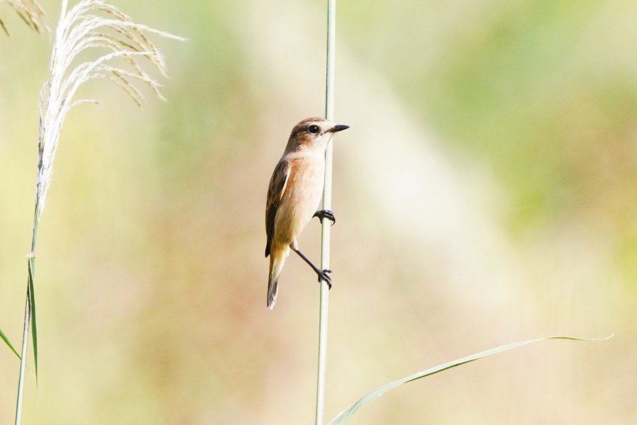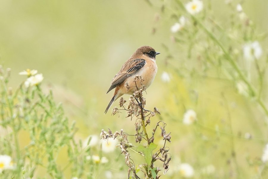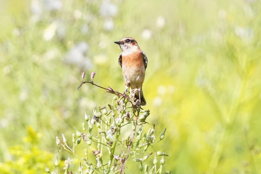 | この日も近くの水田地帯の広い耕作放棄地の草地でノビタキを撮影しました。あちこちにみられるオオアレチノギクやセイタカアワダチソウにとまっていて楽しませてくれました。 |