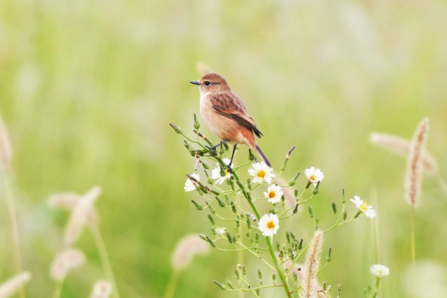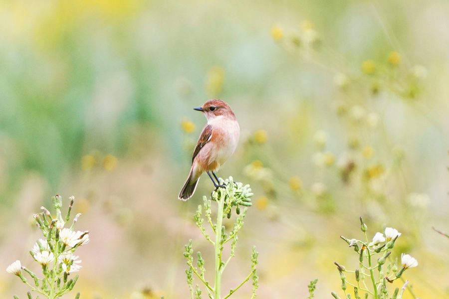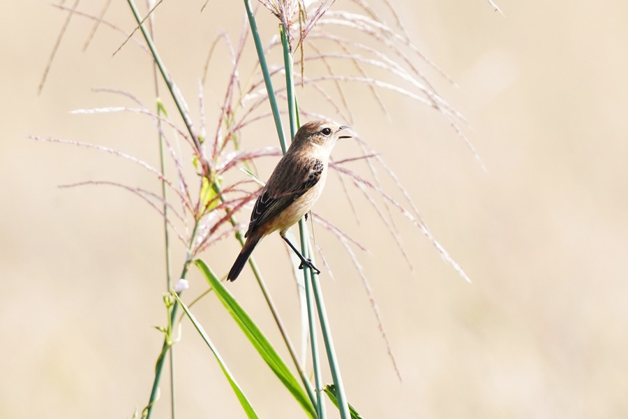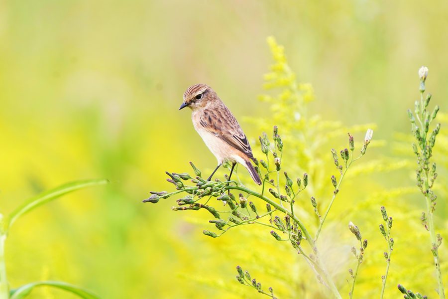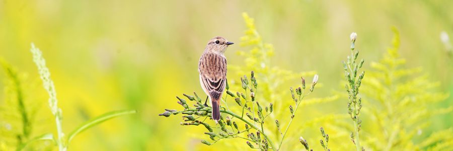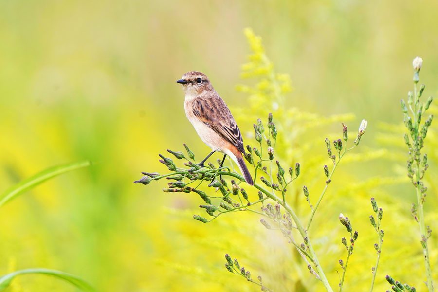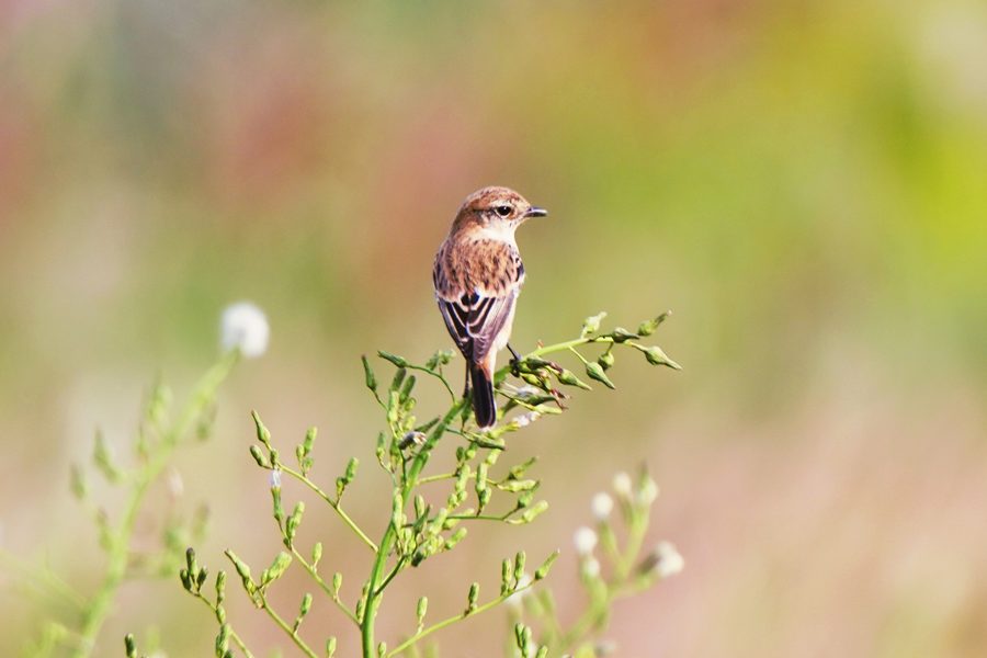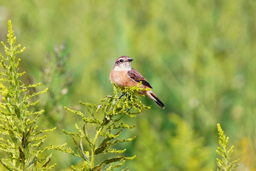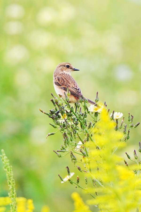 | この日も近くの水田地帯の広い耕作放棄地の草地でノビタキを撮影しました。あちこちにみられるオオアレチノギクやセイタカアワダチソウにとまっていて楽しませてくれました。 |