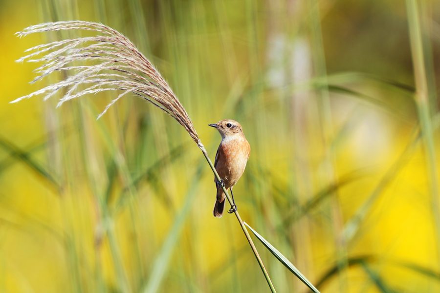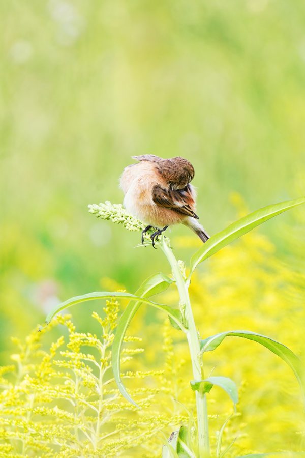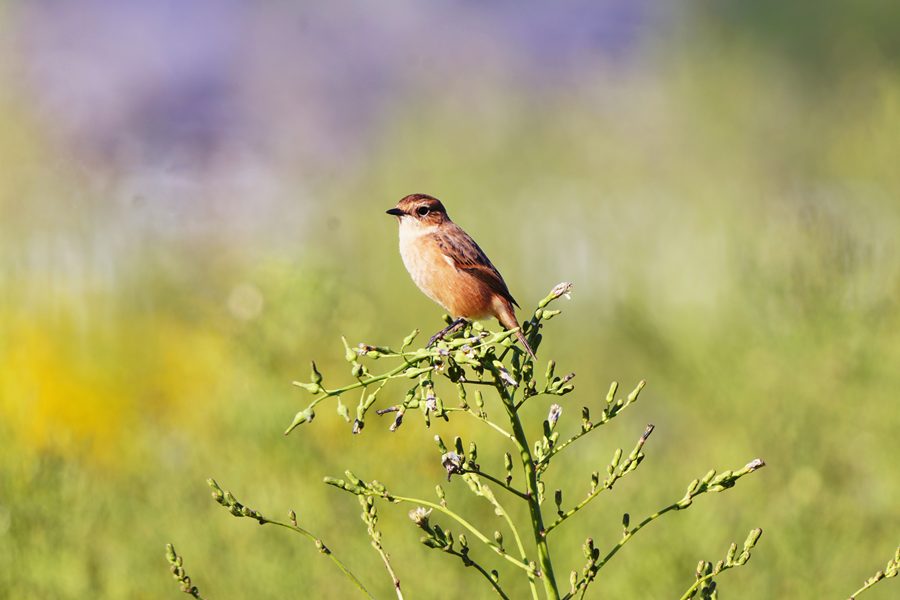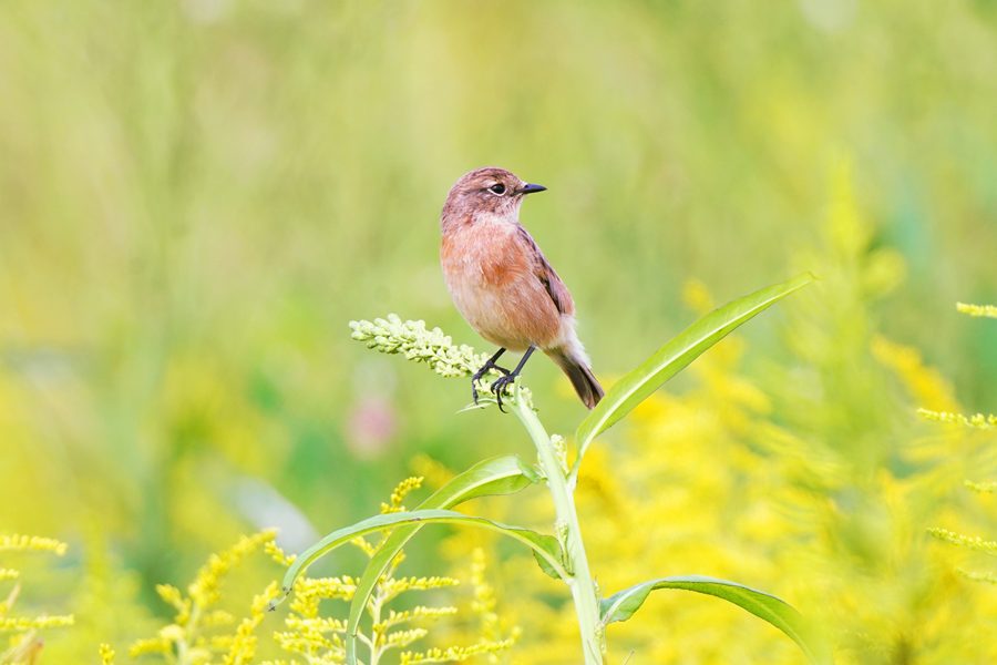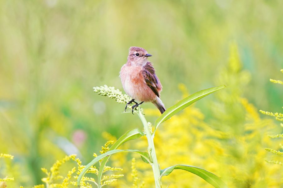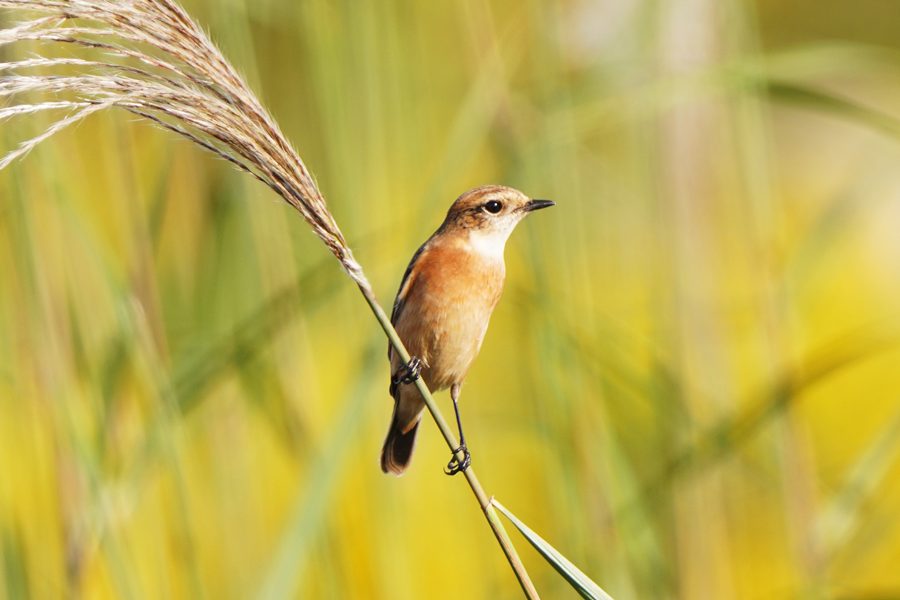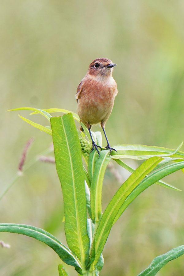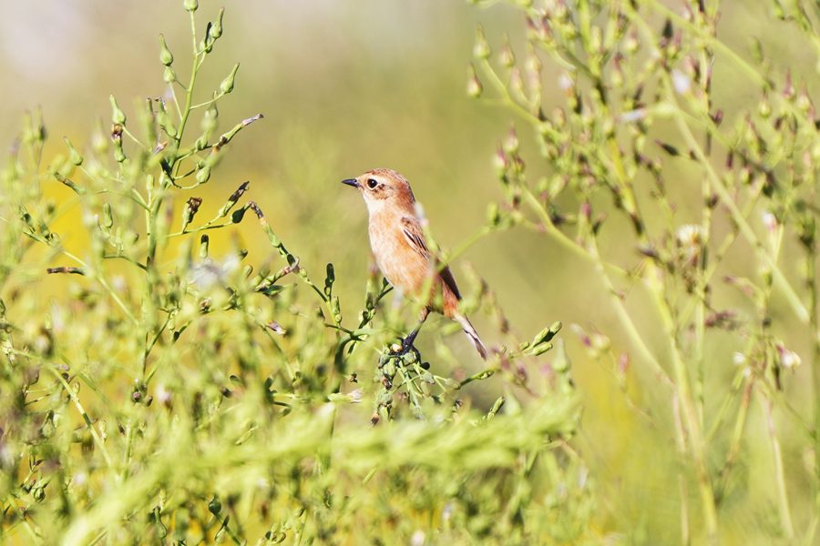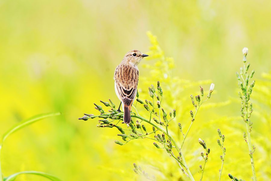 | この日も近くの水田地帯の広い耕作放棄地の草地でノビタキを撮影しました。あちこちにみられるオオアレチノギクやセイタカアワダチソウにとまっていて楽しませてくれました。 |