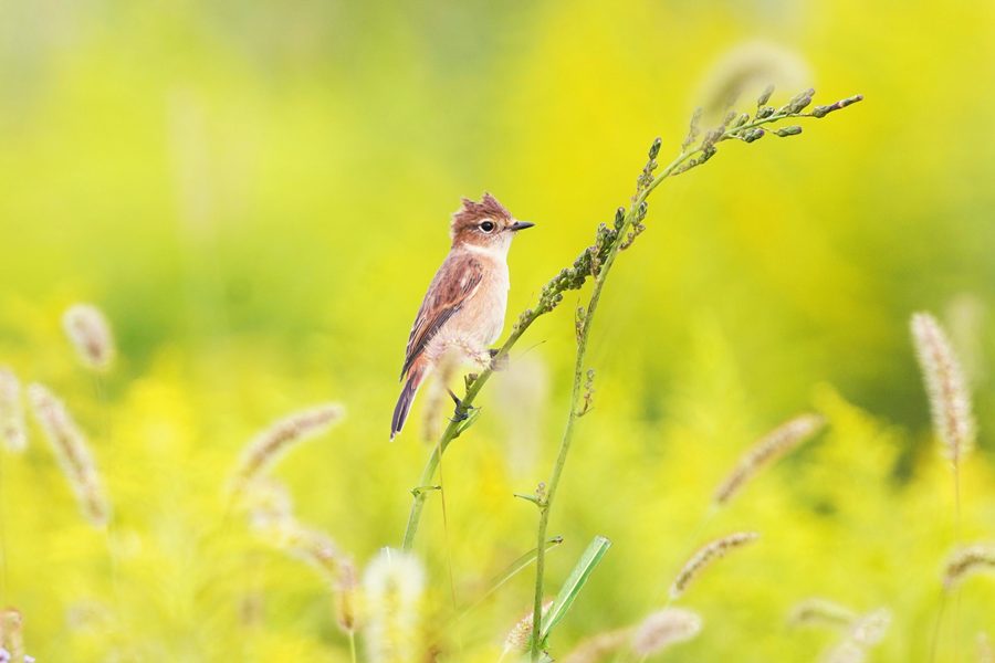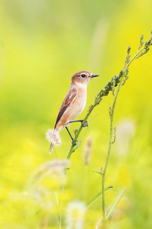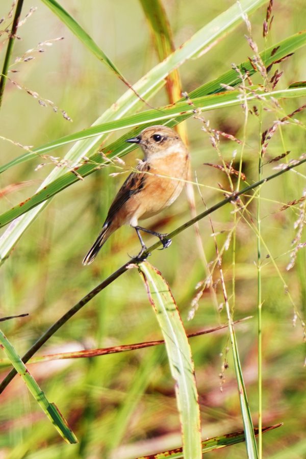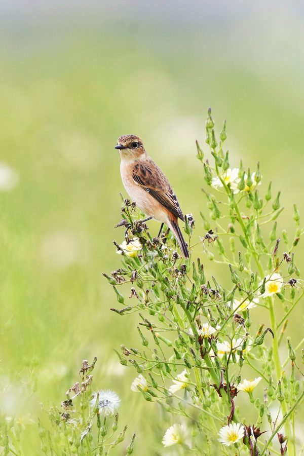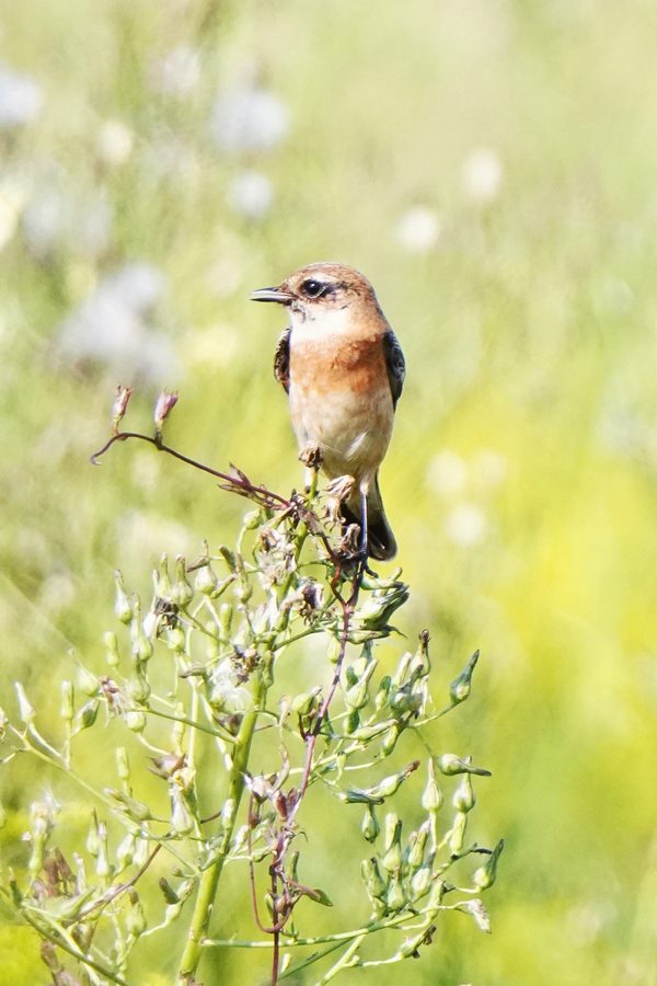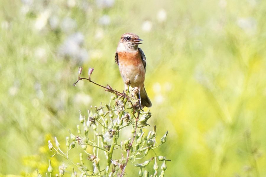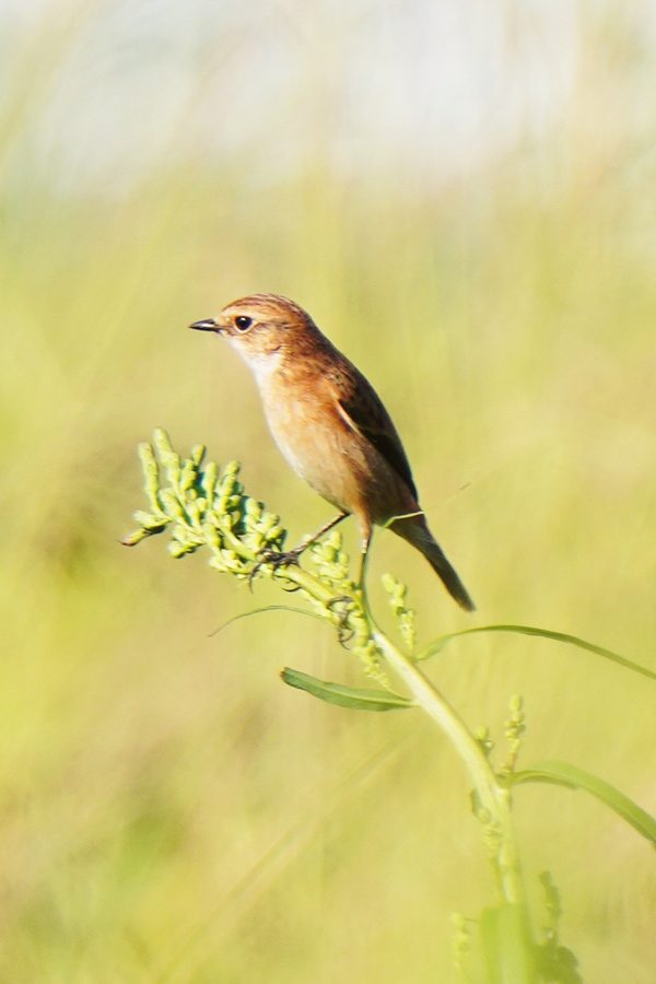 | この日も近くの水田地帯の広い耕作放棄地の草地でノビタキを撮影しました。この日も広い草地の真ん中にいて遠くて大きくトリミングした画像になりました。 |
