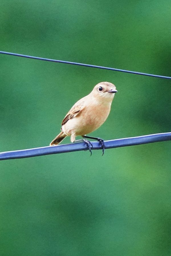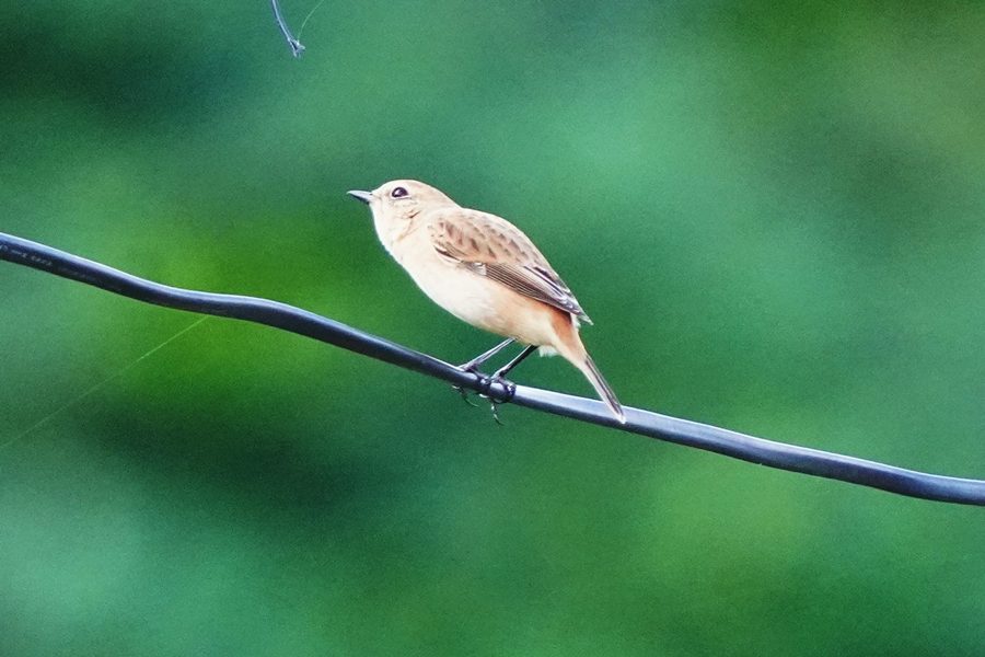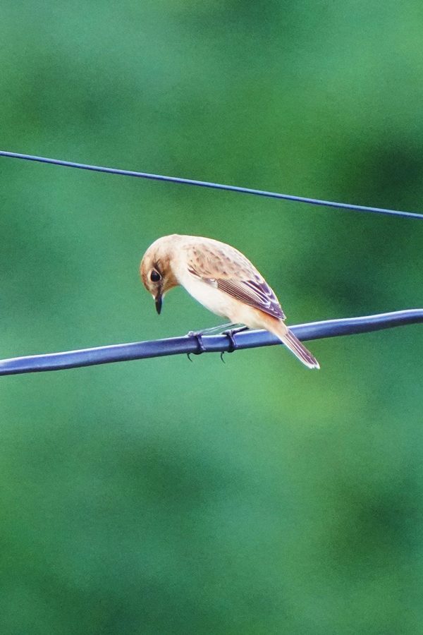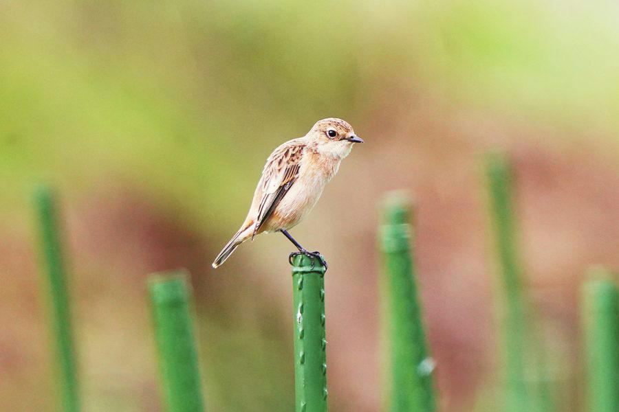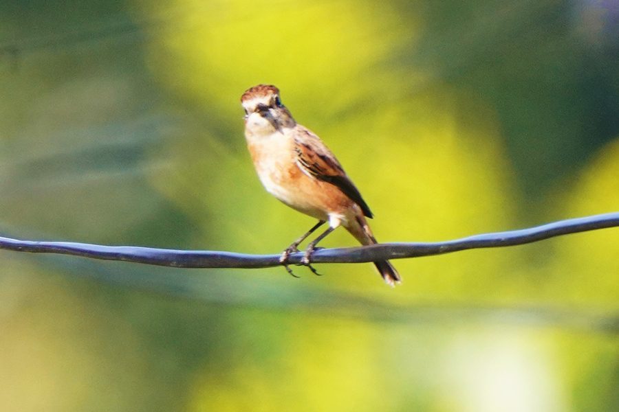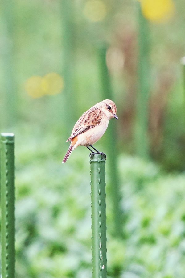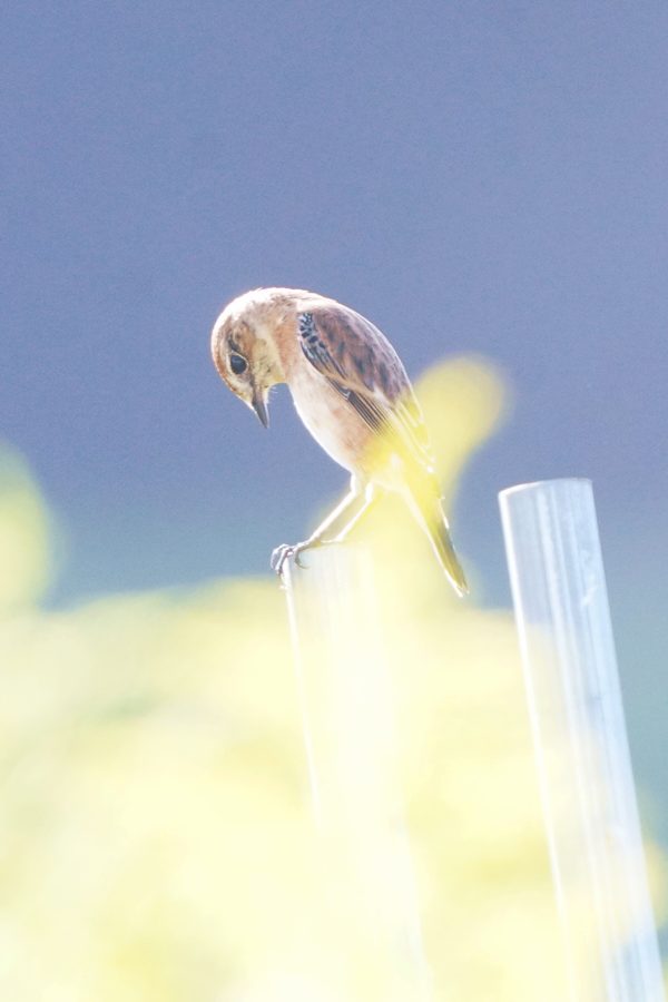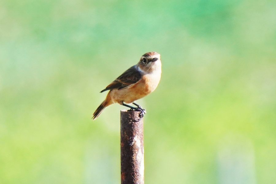 | ノビタキは広い菊畑の真ん中にいてなかなか近づいてくれません。咲いた菊の花にも止まってくれません。ポールや支柱、ワイヤーなどにとまったノビタキの写真になりました。 |