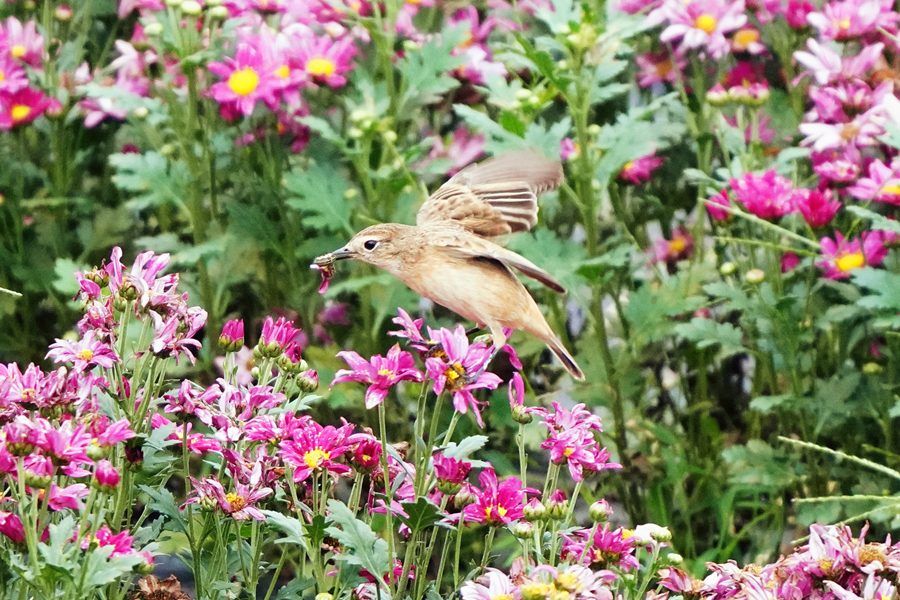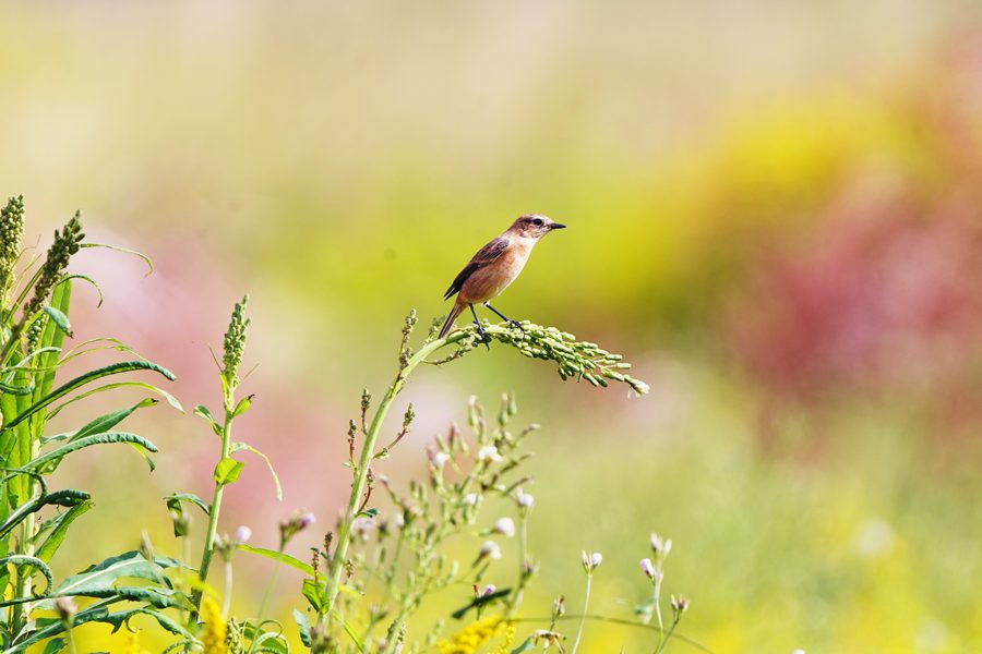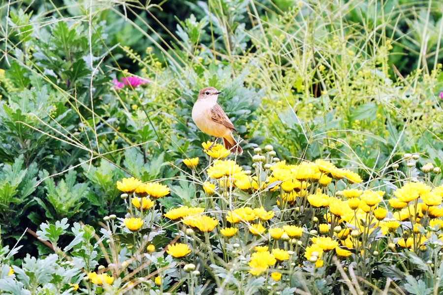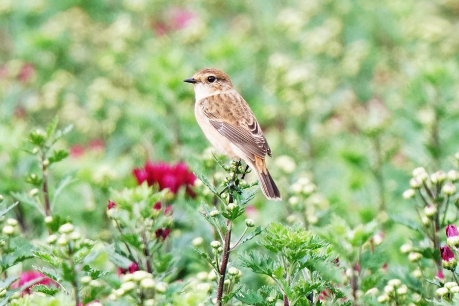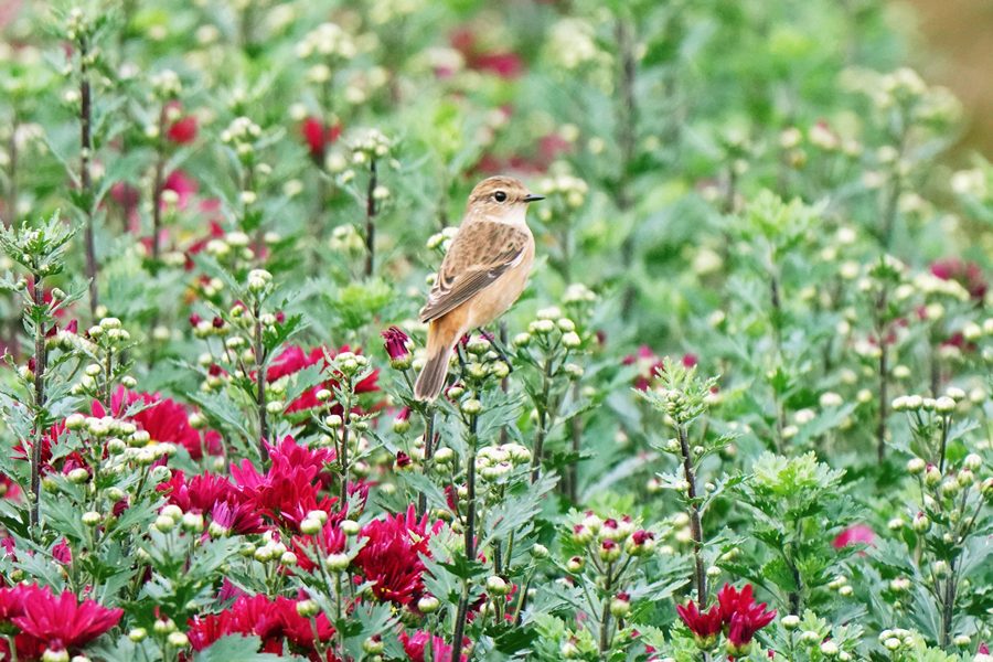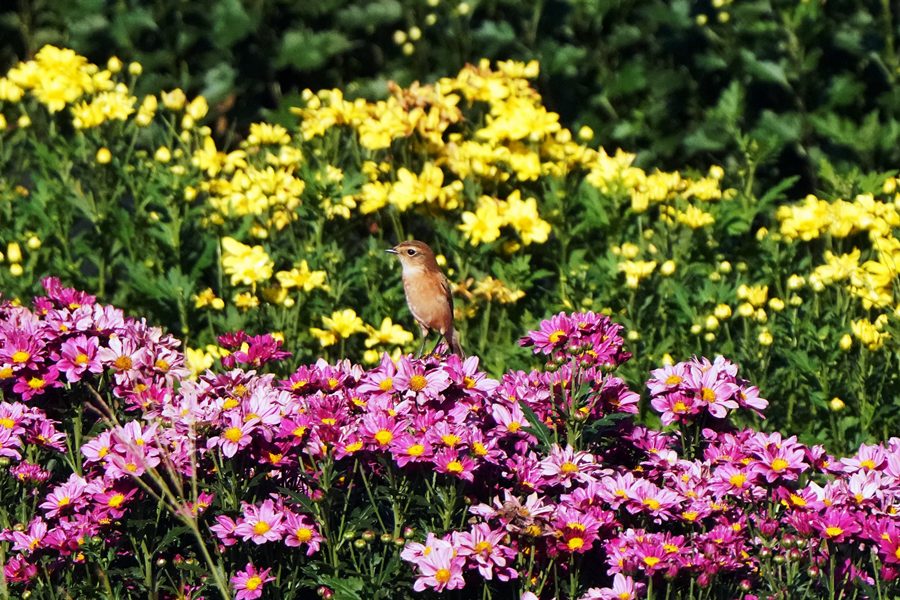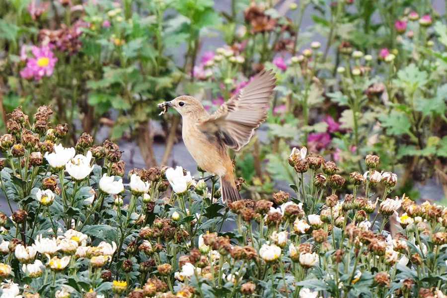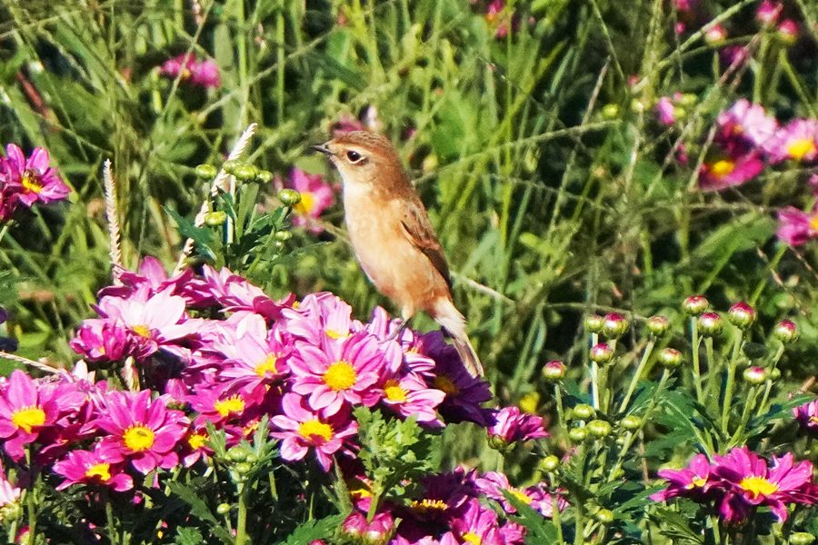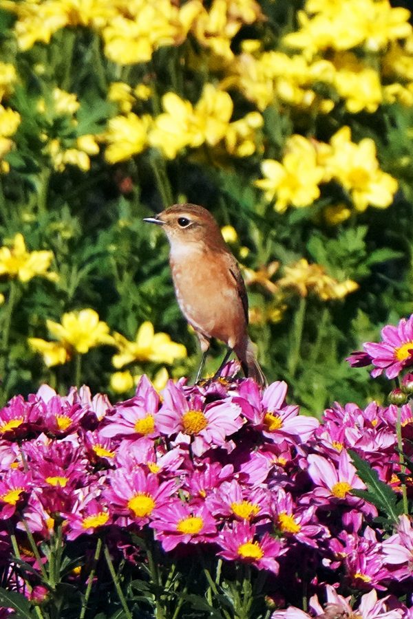 | この日は黄・赤・白の菊の花が咲いている菊畑にノビタキがいました。畑の境のネットやポールや支柱にとまっていて、時々、菊の花に降りてきます。 |