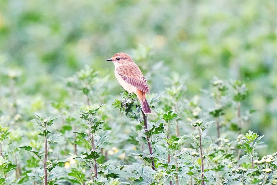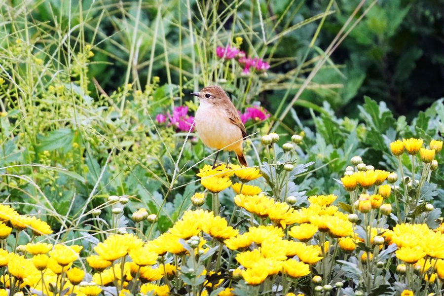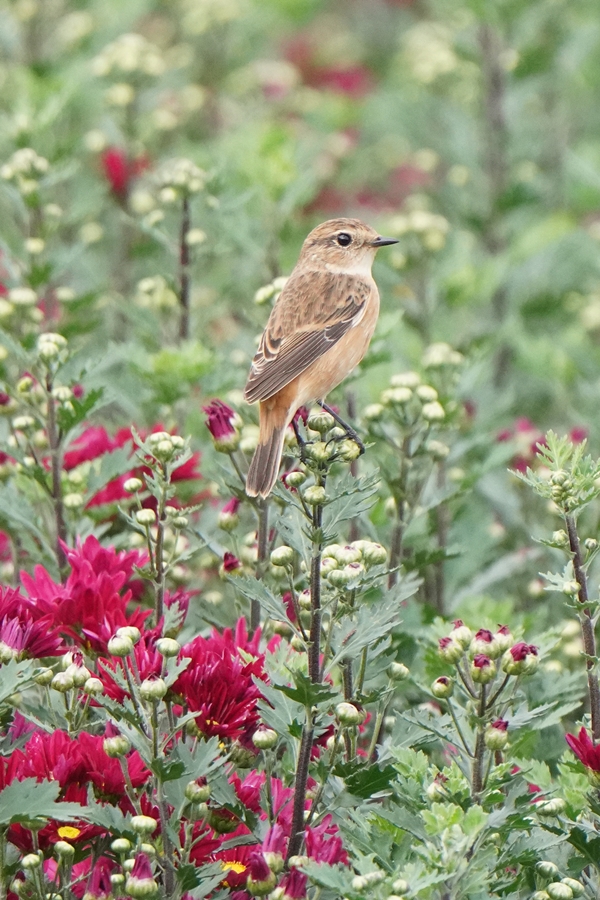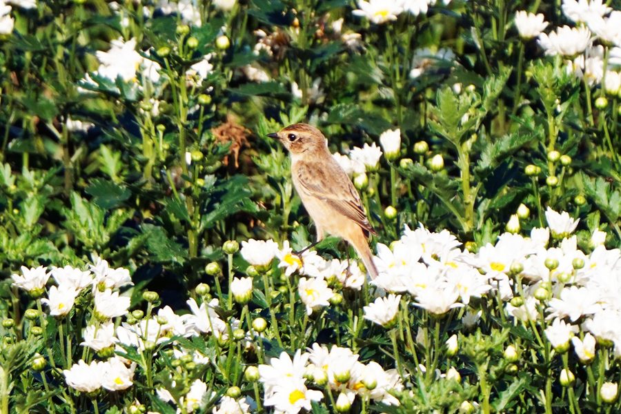 | 支柱やポールではなくようやく菊にノビタキがとまってくれました。 |