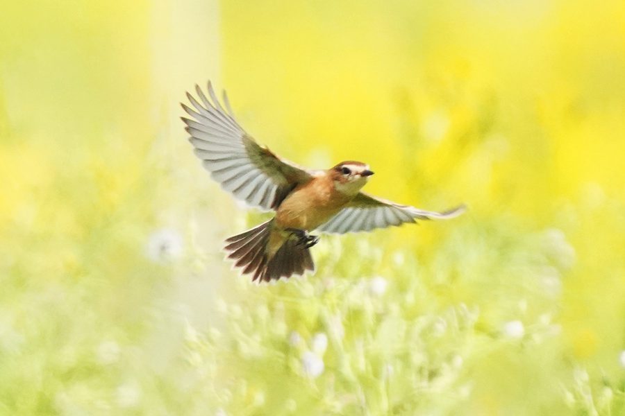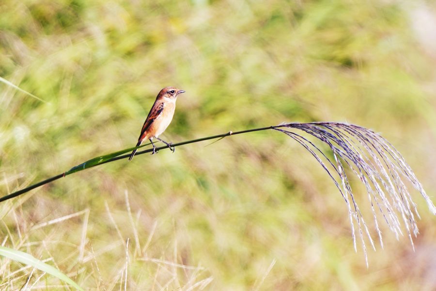 | 近くの水田地帯の広い耕作放棄地の草地でノビタキを撮影しました。今までは3羽ほどしかいなかったのですが、一週間ぶりに来てみると数が増えて、撮影している道路に近い位置まで来てくれました。 |