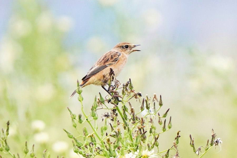 | 19日に撮影した近くの水田地帯の耕作放棄地のノビタキです。14日に撮影した時と比べると数は少し減りましたが、この日もオオアレチノギクやセイタカアワダチソウにとまって楽しませてくれました。 |