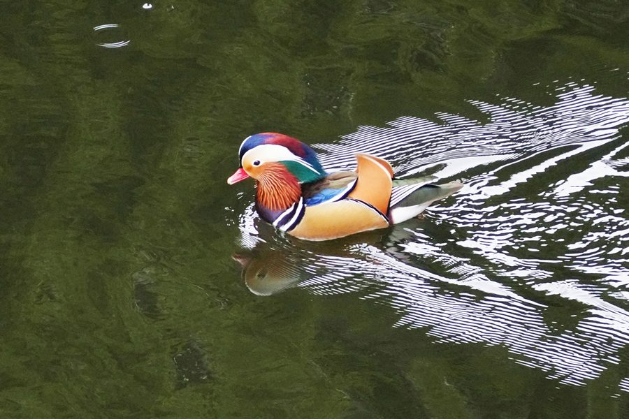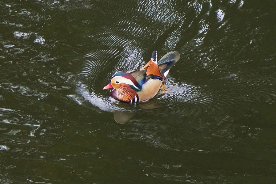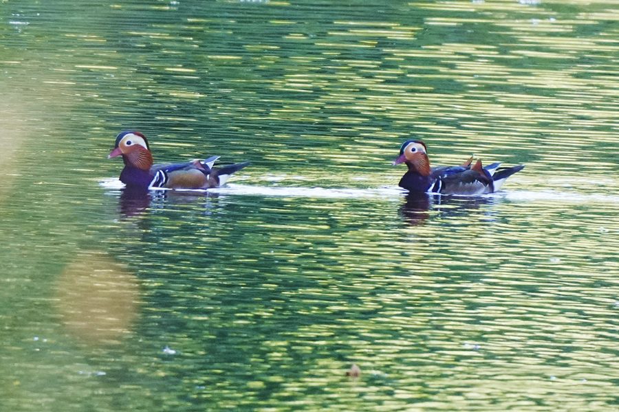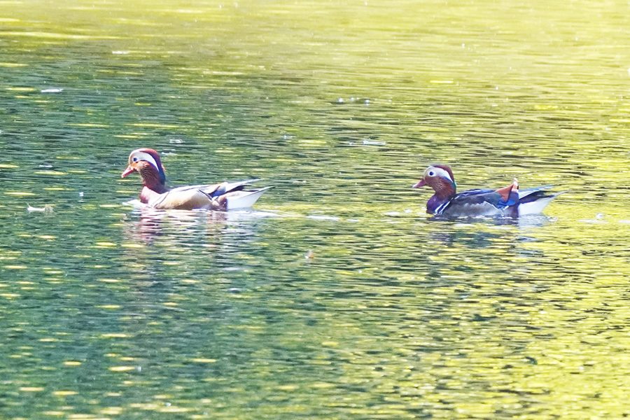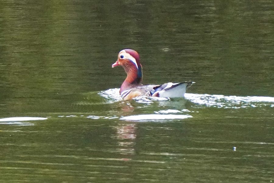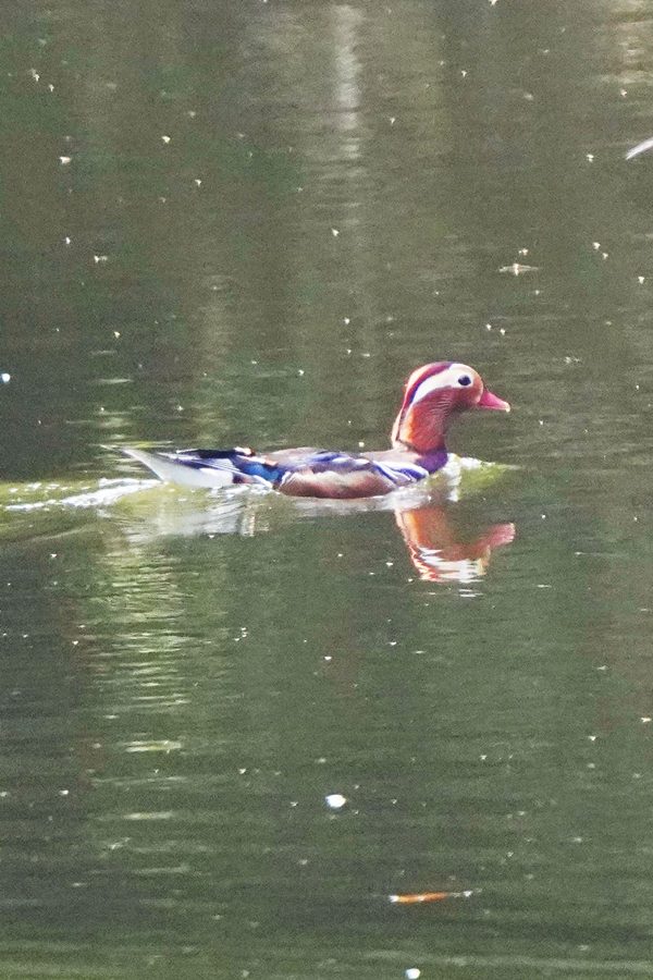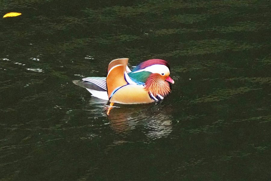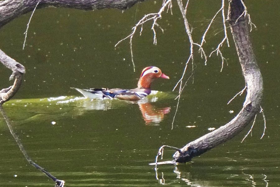 | 地元の山の上の池のもオシドリです。池にかかった橋の上から撮りました。オシドリは左右の両岸の水面に茂った木の下にいて、時々、姿を見せて池を横断します。 |