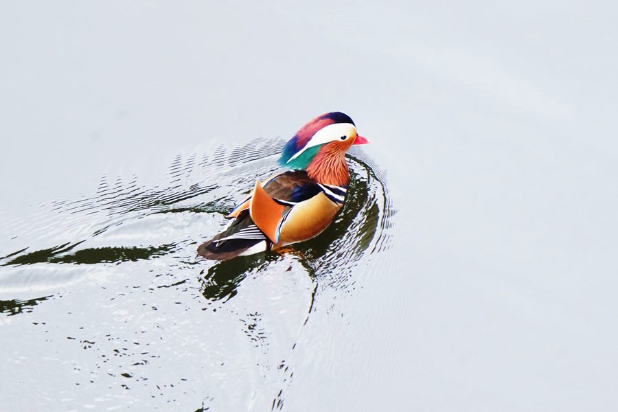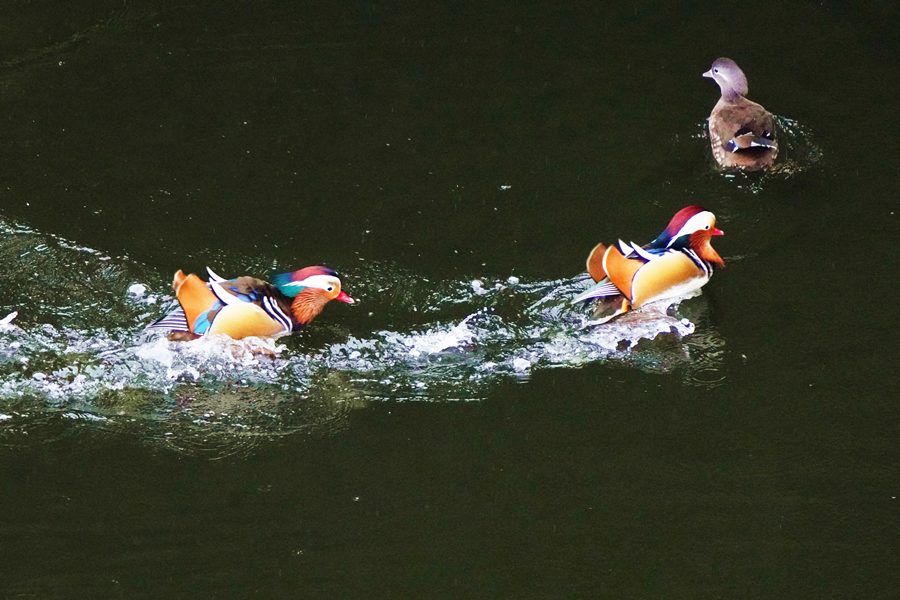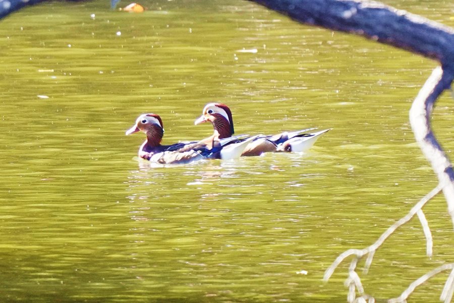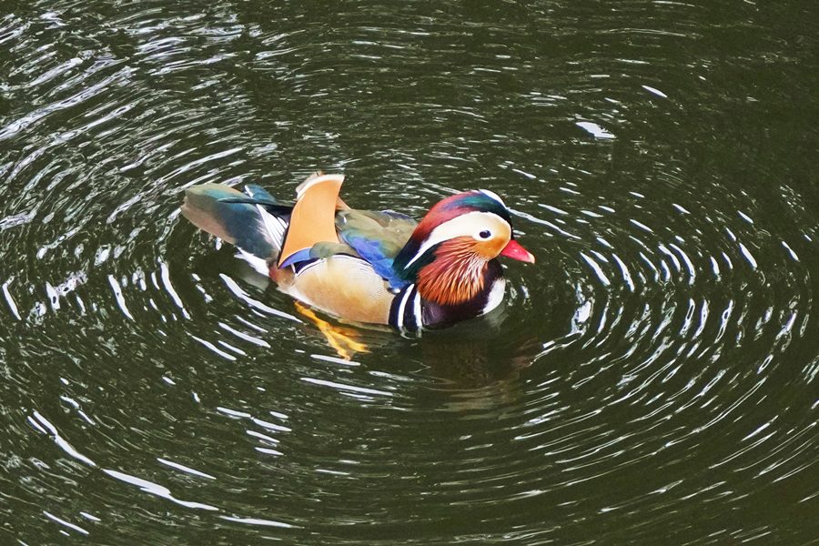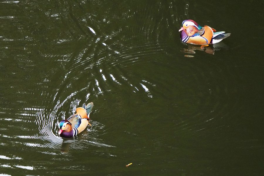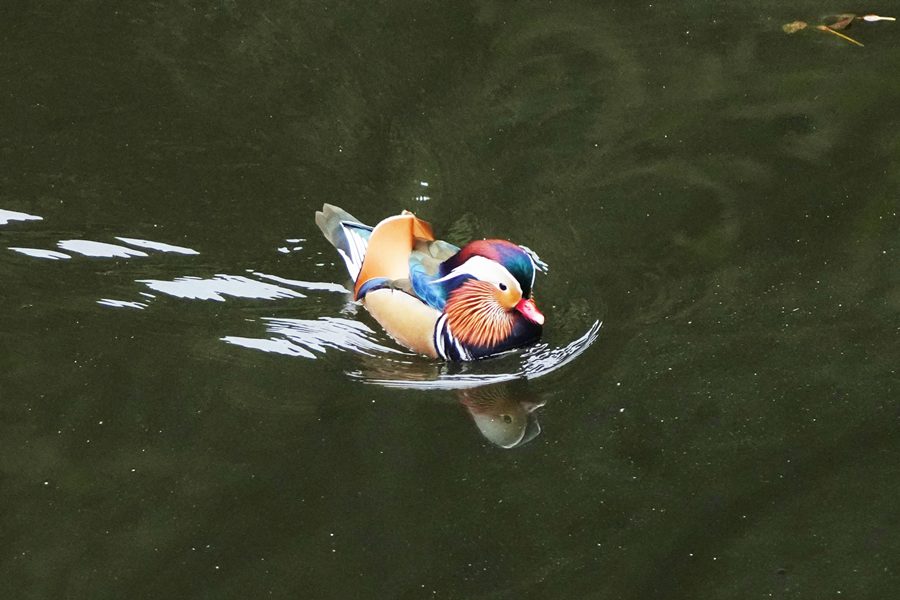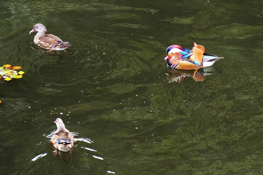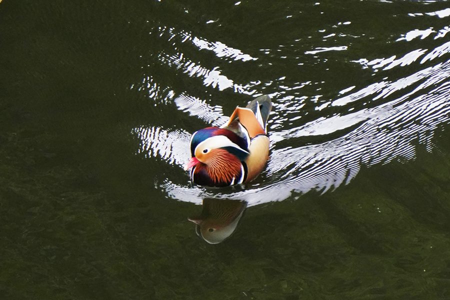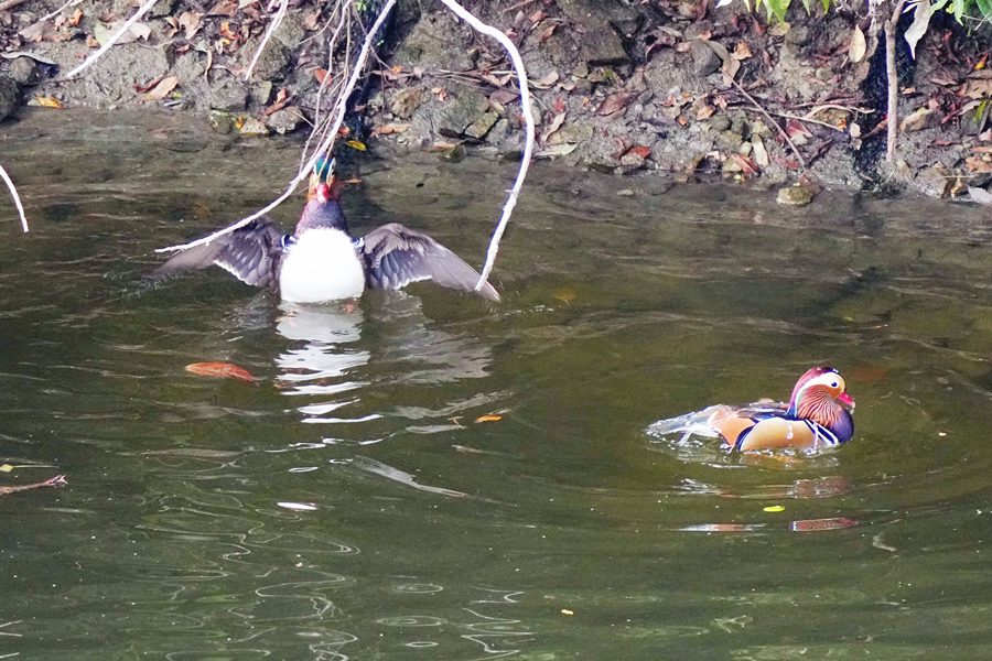 | 地元の山の上の池のもオシドリです。池にかかった橋の上から撮りました。オシドリは左右の両岸の水面に茂った木の下にいて、時々、姿を見せて池を横断します。 |