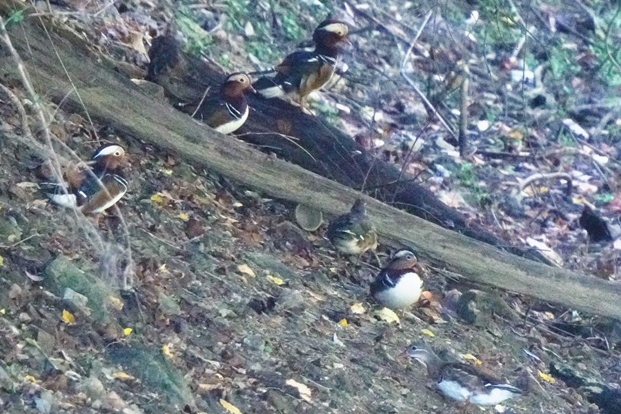 | ため池の奥の暗い岸には8羽ほどのオシドリが休んでいました。 |