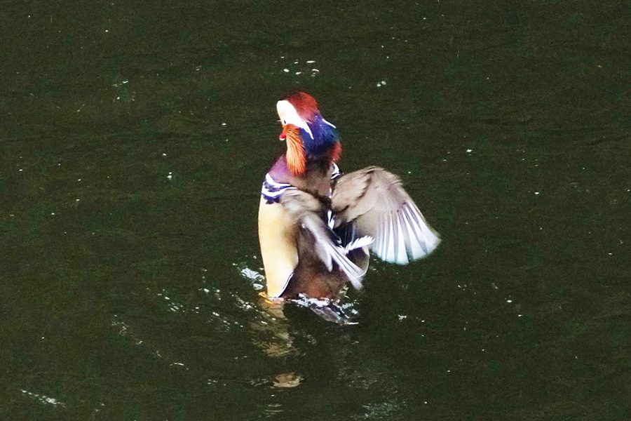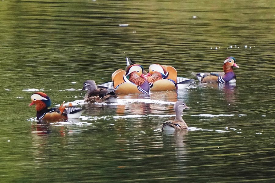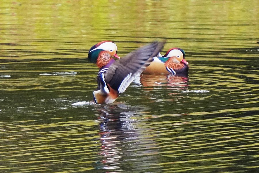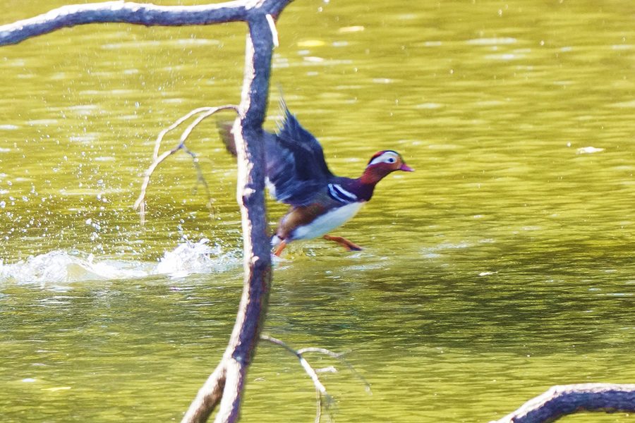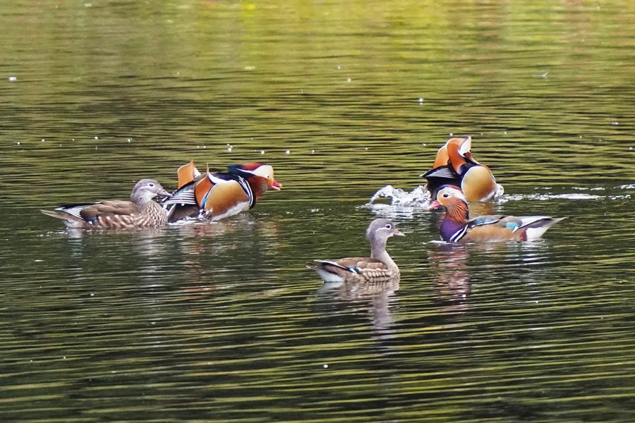| 地元の山の中のため池のもオシドリです。いつもため池の奥の暗い岸で休んでいて、池の真ん中に来てくれなかったのですが、この日は池の真ん中で10羽ほどが水面に出てきて、羽ばたいたり、追いかけあいをしていました。 |