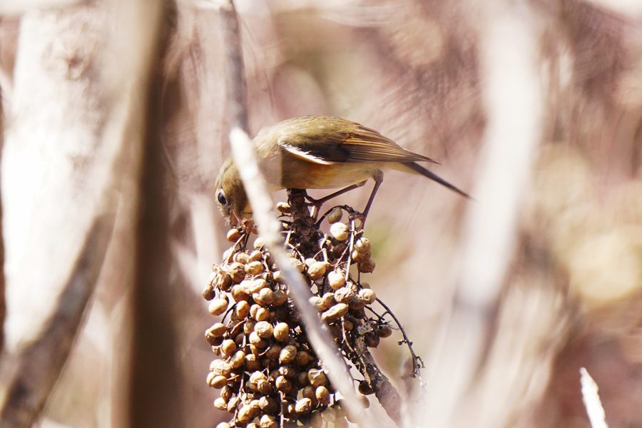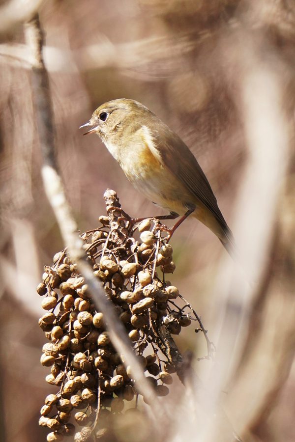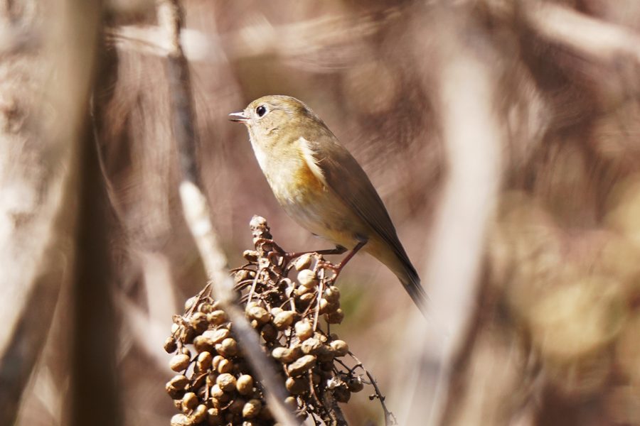 | ルリビタキの雌です。尾羽の上面の青い部分が目立たなかったので一瞬、ジョウビタキ♀かなと思ったのですが、翼に白斑がないのでルリビタキ♀だとわかりました。ハゼノキの実を咥えていました。 |