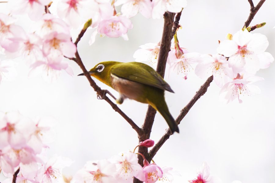 | 今年はいつ行く公園や山ではいつも当たり前のようにいるメジロがあまり見られません。毎年、河津桜に来るメジロを撮影している近くの大きな公園や山の上の公園でも河津桜は八分咲きなのですが待っても待っても来てくれませんでした。この日ようやく地元の山の麓の早咲きの桜に姿を見せたメジロを撮影できました。 |