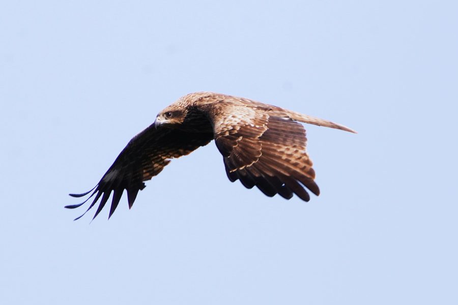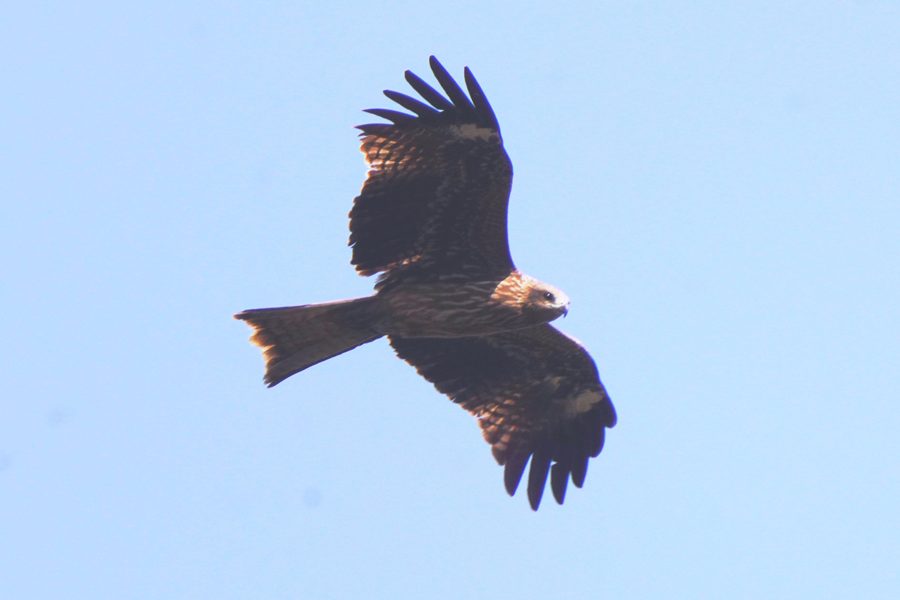 | ハゼノキのルリビタキ♀とコゲラを撮影した帰り、3羽のトビが上空を旋回しているのを見つけました。 |