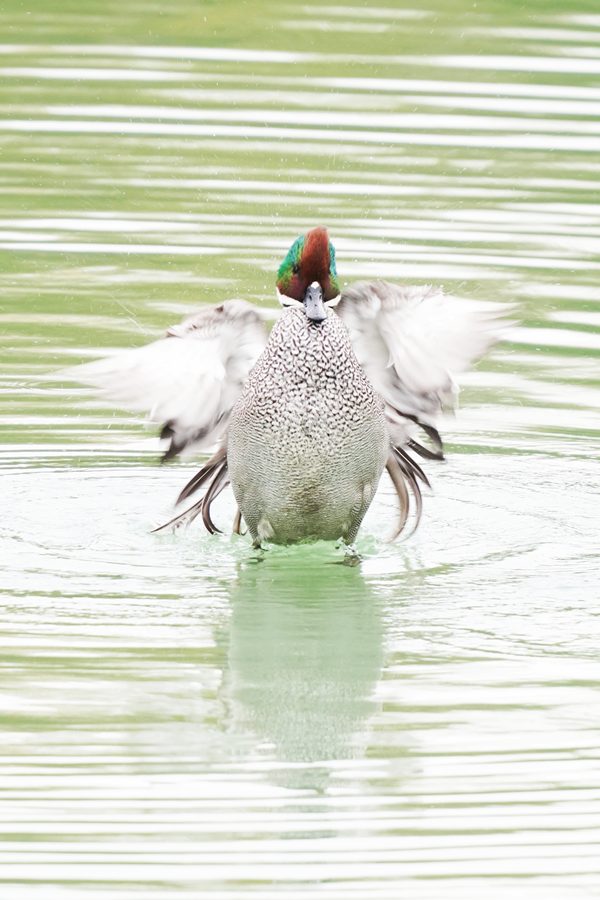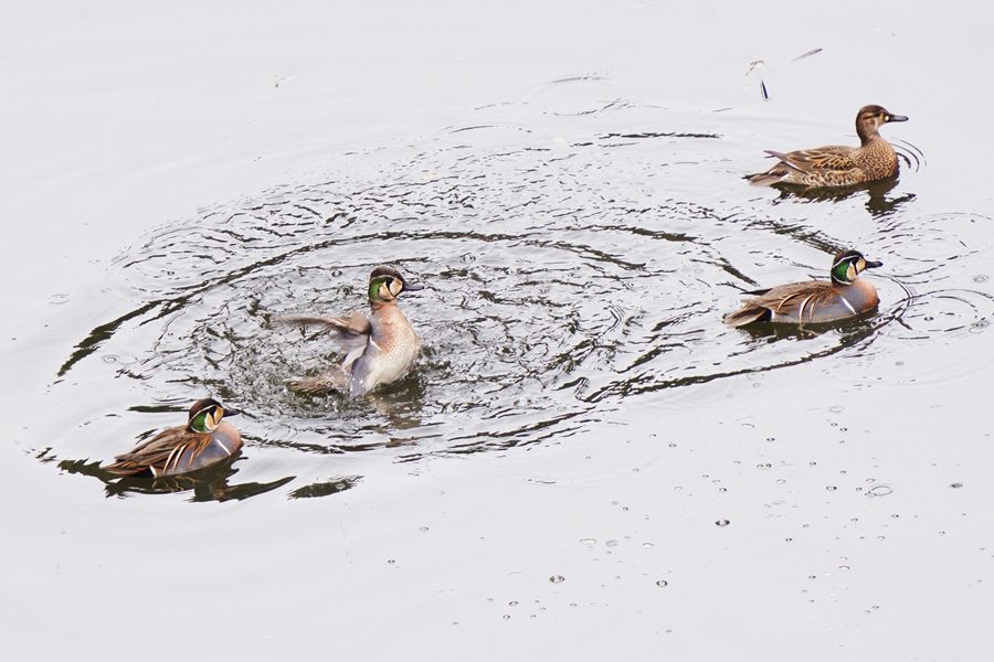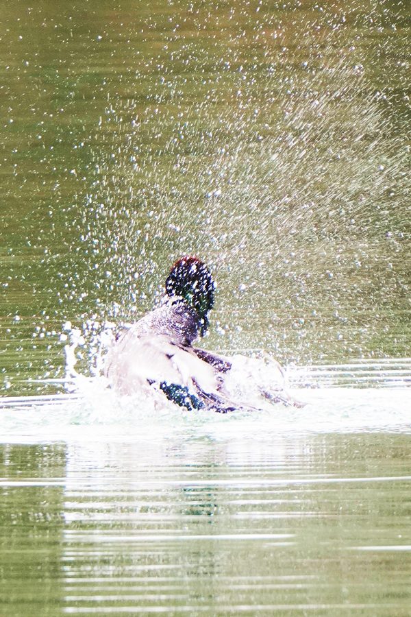 | 凄まじい勢いで翼を動かして水浴びしているヨシガモを見つけました。水滴が舞い上がってヨシガモにはピントが合いませんでした。この後、ヨシガモは羽繕いをしたり、羽ばたいたりしてのんびりと過ごしていました。 |
