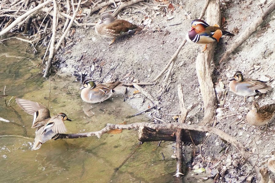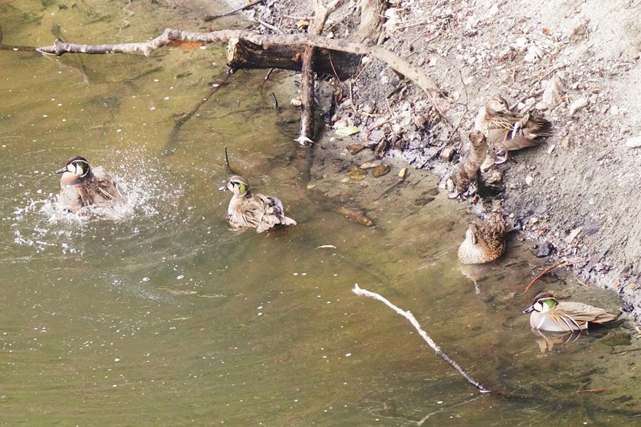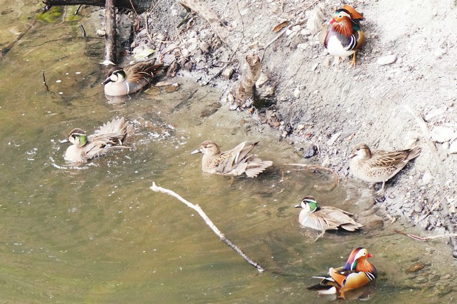 | 早咲きの桜に来たメジロを撮影した後、山を登って山の上の池でオシドリと一緒にいるトモエガモを撮影しました。この日は活発にトモエガモは活動していて、2回池の真ん中にに出てきました。また、水浴びもしました。 |
