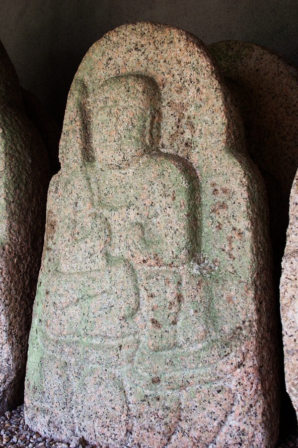 | 「深谷十三仏」は山口市徳地深谷の集落への入り口近くの小さな丘の上の堂の中に二列に並べて安置されている。一石一尊の十三仏で、それぞれ花崗岩の座像で、二重光背を型どった石材に薄肉彫りしている。中央の虚空像菩薩が最も大きく、高さ87㎝で、他の像はほぼ同じで高さ70㎝ほどである。虚空像菩薩の背面に「応永十四丁亥二月彼岸逆修」と刻銘があり、応永十四年(1407)の彼岸に建立されたものである。 頭も身部もあまり凹凸がなく薄肉彫りというより、線彫りに近い。堂内に安置されているためかその線もわかりにくく、像容を見ただけでは尊名が判断しにくい。地方作であるが、素朴な味わいのある石仏である。 十三仏石仏は全国にみられるが、千葉県や埼玉県などの関東地方と生駒山山麓の関西地方に特に多く見られる。これらは板碑で一石で十三仏を種子または像容であらわす。深谷十三仏のような一石一尊仏は全国的に見ても少ない。十三仏碑の初現は千葉県の印旛村の迎福寺の永和4年(1378)銘の種子碑である。像容を刻んだものでは、この深谷十三仏が最も古い。 |