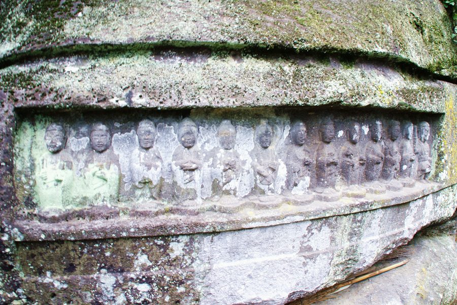 | 羽黒山の西麓の小さな墓地の上段に安山岩の大きな岩が露出している。その岩壁に幅250㎝、高さ70㎝の細長い龕を設けて、龕いっぱいに並立に十三仏を厚肉彫りする。向かって右から、不動・釈迦・文殊・普賢・地蔵・弥勒・薬師・観音・勢至・阿弥陀・阿しゅく・大日・虚空蔵の仏像である。元禄十一年七月「高山寺」「大方寺」の合同供養として像立された旨の刻銘がある。4頭身で如来や菩薩像は整った顔で、個性的で魅力的な磨崖仏である。 |