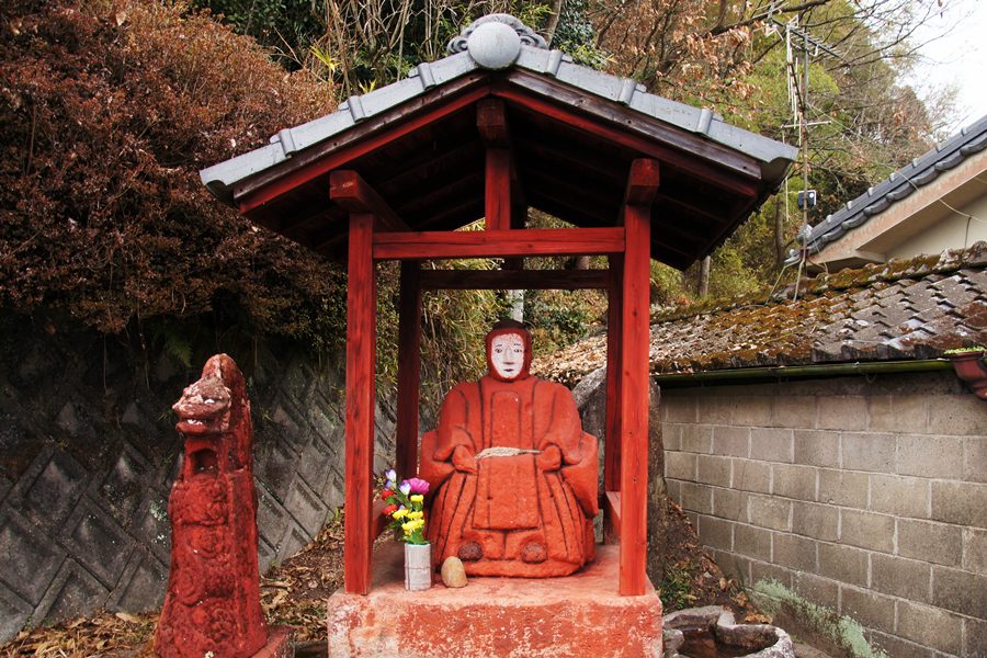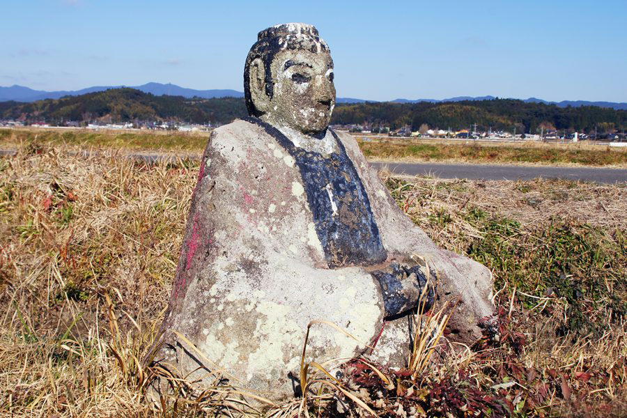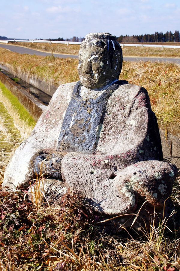 | 旧菱刈町を流れる川内川の流域は広い水田地帯になっていて、「築地の田の神」はその水田地帯の用水路の横に水田に向かって座している。この像も神官型座像の田の神で両手を膝の上で合わせて笏をさせるように輪組している。長い間、化粧(彩色)されていないようで黒と白の彩色の跡が一部、残るのみで、供花された痕跡もなく忘れられたような田の神である。しかし、衣文などは直線的で硬い表現であるが造形はしっかりしていて、旧菱刈町の神官型座像の田の神の中では優れた田の神像である。 |