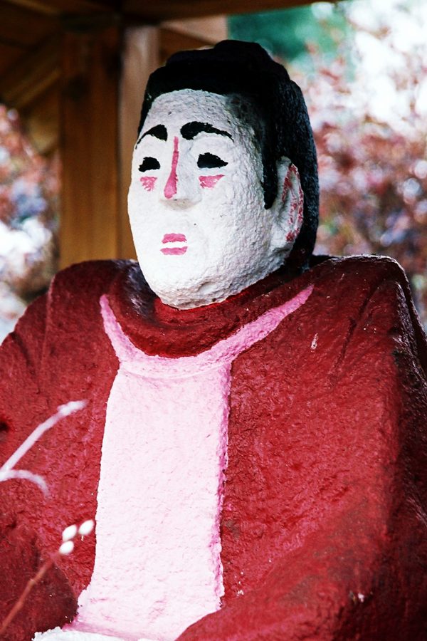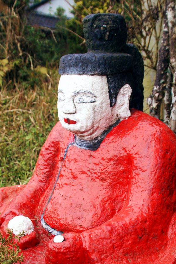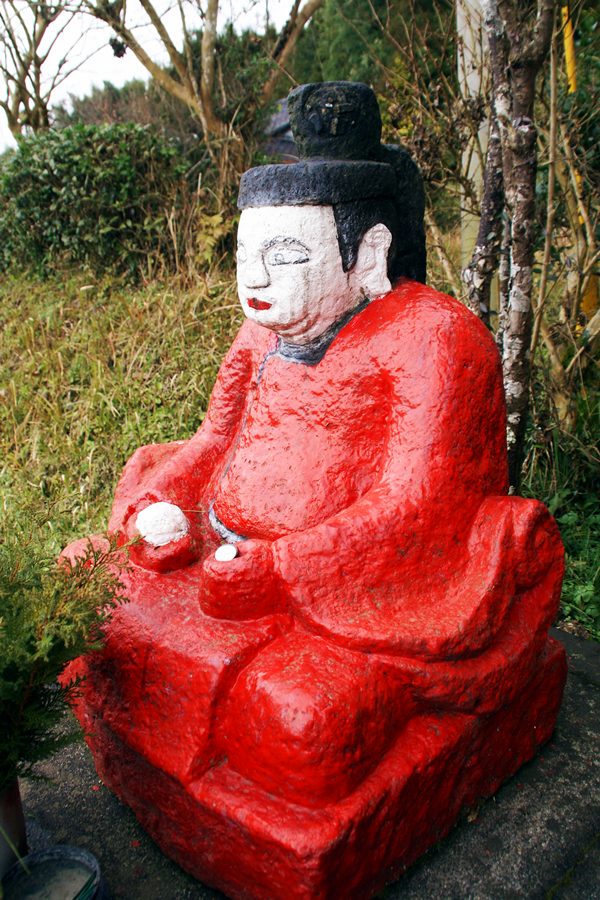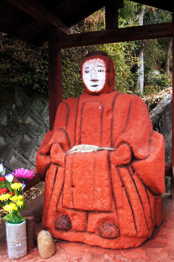 | 旧菱刈町は鹿児島県で唯一、衣冠束帯姿など公家装束の神官型の田の神が他の型の田の神より多い地域である。鹿児島県ても時々見かける神官型座像だけでなく、宮崎県でよく見かける腰掛け神官型もある。そこで神官型の田の神を中心に紹介する。まず始め4体は神官型座像の田の神である。 九州道「栗野IC」より国道268号線を北へあがって伊佐市菱刈に入って最初に目にする田の神が国道268号線沿いにある山野線「湯之尾駅」跡の公園にある「猶原の田の神」である。新しい覆堂の中に国道に向かって座している。神官型座像の田の神で両手を膝の上に合わせて笏を持たすために輪組にしている。赤と白、黒、ピンク色で化粧(彩色)している。雑な彩色をしている田の神が多い中でこの像は白い顔の目の下と鼻筋にピンク色を入れ、上品な化粧となっていて、化粧した人のセンスの良さが光る田の神像である。 |