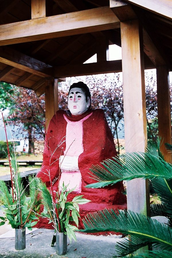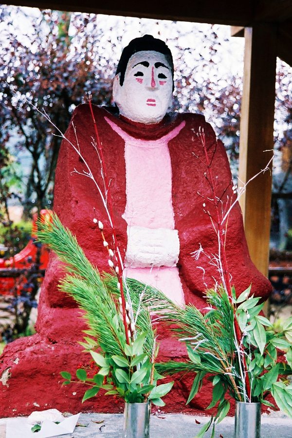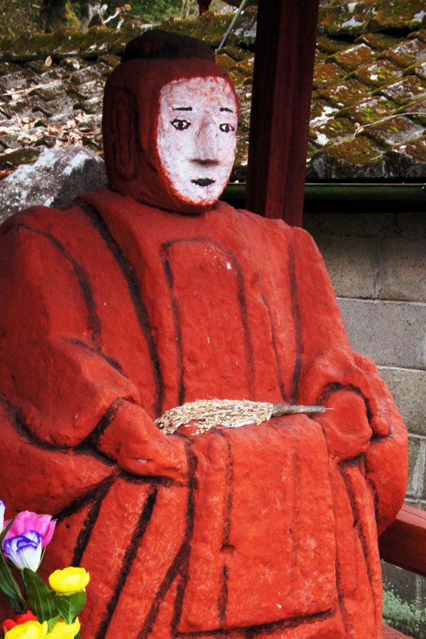 | 菱刈下手の仁王集落の用水路沿いにある墓地の横に小さな集会所があり、集会所の裏に用水と水田に向いて田の神像が座している。神官型座像の田の神で右手で握り飯を持ち、左手を膝の上で輪組する。輪組した手に笏やメシゲを持たしたと思われる。冠は甲のみを表した田の神が多い中、この像は巾子と纓も彫っている。赤と白・黒で化粧(彩色)しているが目鼻の化粧は稚拙である。 |