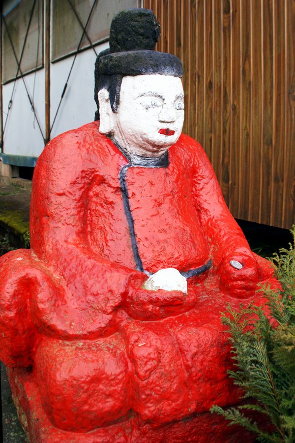 | 前目の田の神は宮崎県でよく見かける腰掛け神官型の田の神で、瓦葺きの吹き抜けの覆屋の中に祀られている。顔だけを白く彩色し、残りはすべてベンガラ色に塗られている。手は膝の上で合わせて輪組するのではなく、別々に膝の上に置いている。田の神像の横に龍神像があり、これも田の神像と覆屋の柱と一緒にベンガラ色に塗られていた。 |