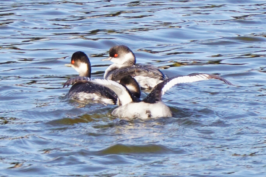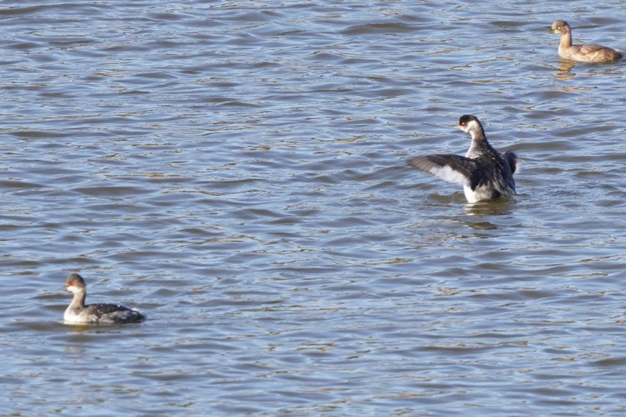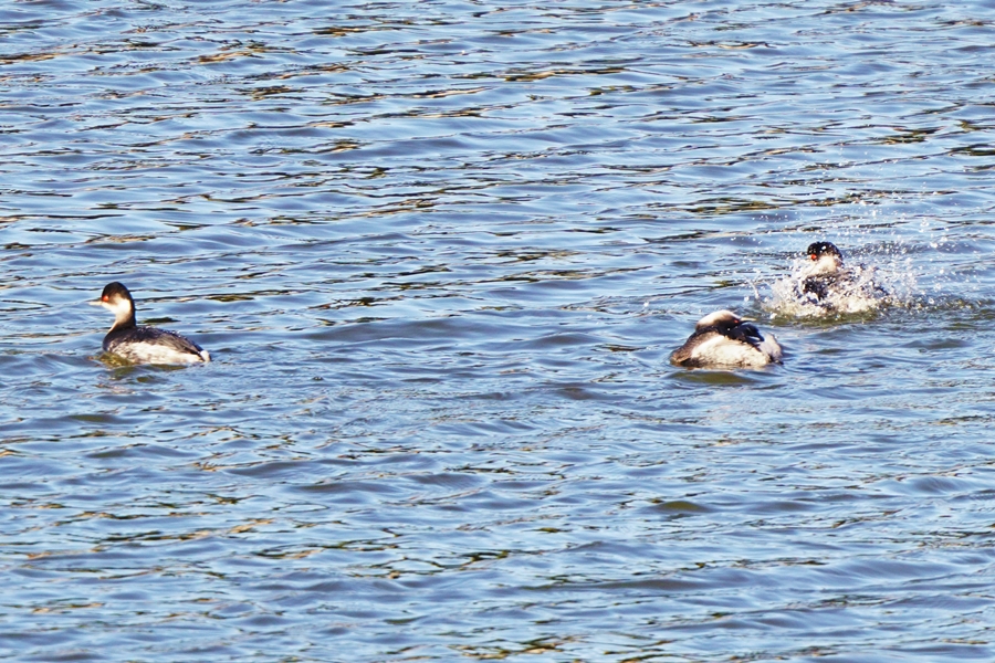 | 池の真ん中近くに3羽のハジロカイツブリがいました。羽繕いをしたり羽ばたいたりしていました。 |