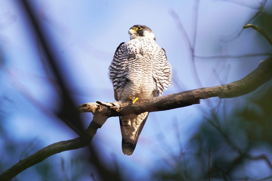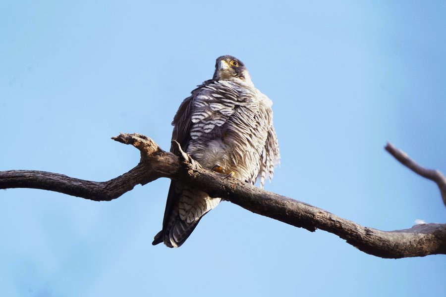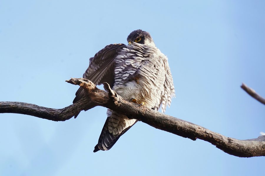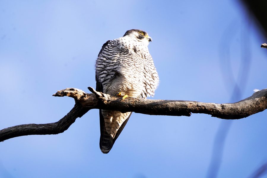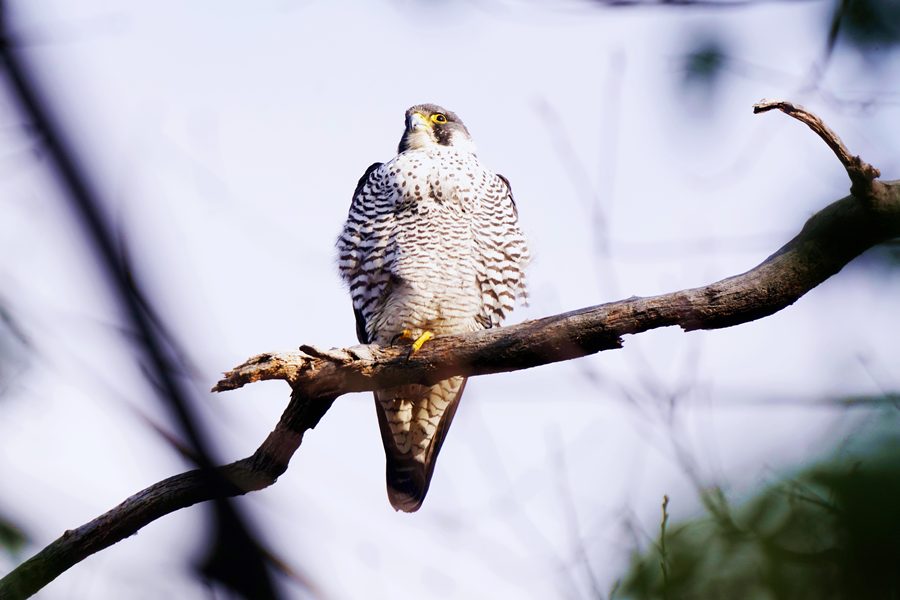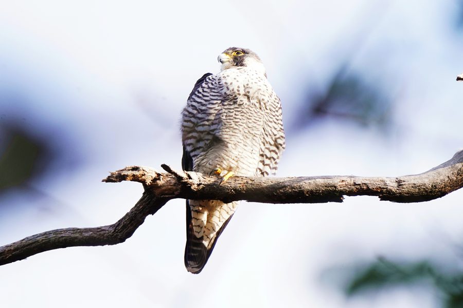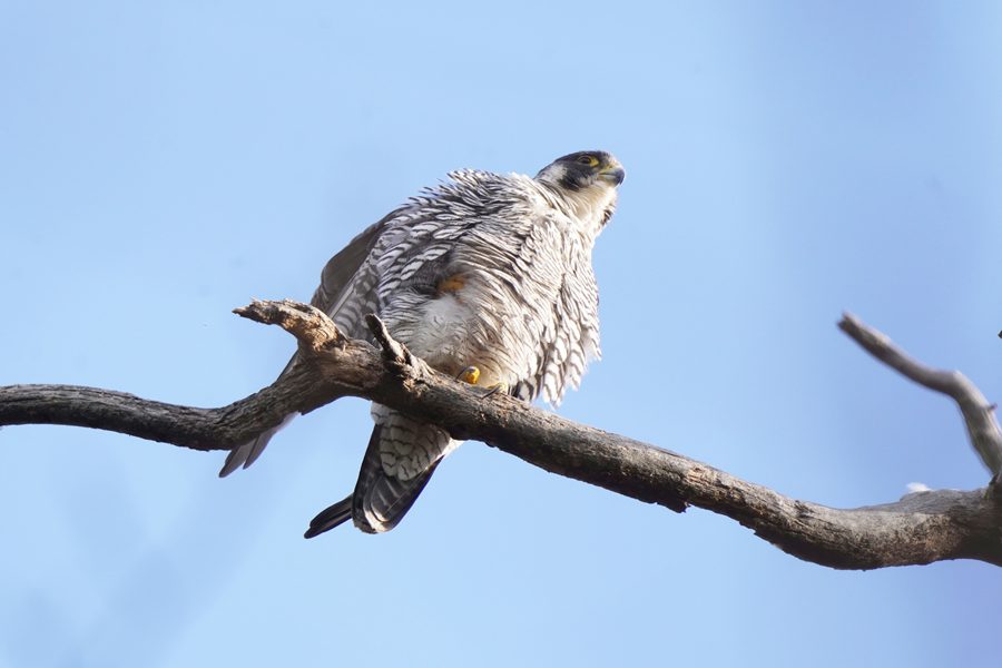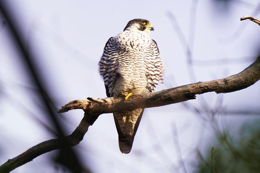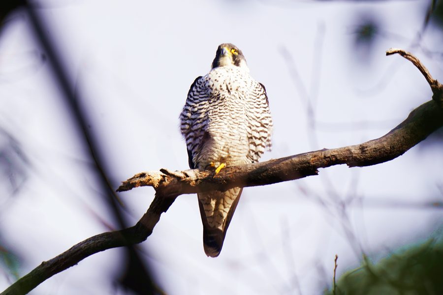 | 離れた場所から撮影しました。ただ、枝被りにはなりませんでしたが、ハヤブサの周りには枝など多く写ります。 |