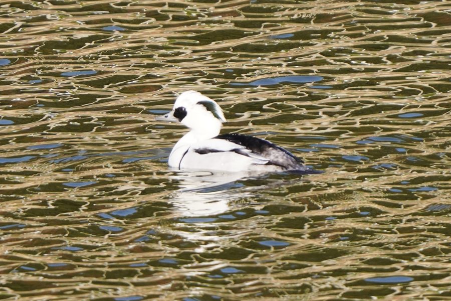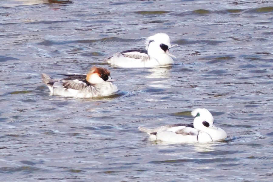 | トモエガモとともにこの日もミコアイサがいました。白い雄はまだ1羽だけで、他は雌とエクリプスです。 |