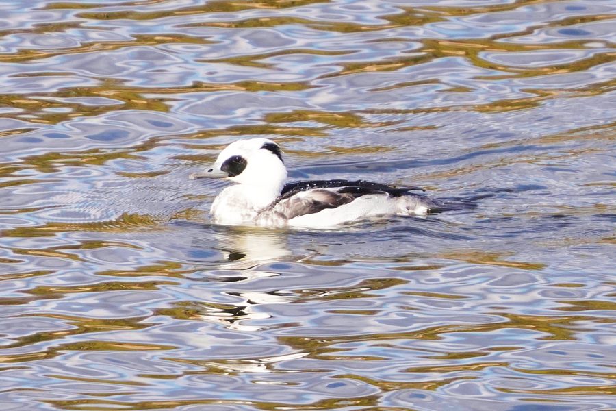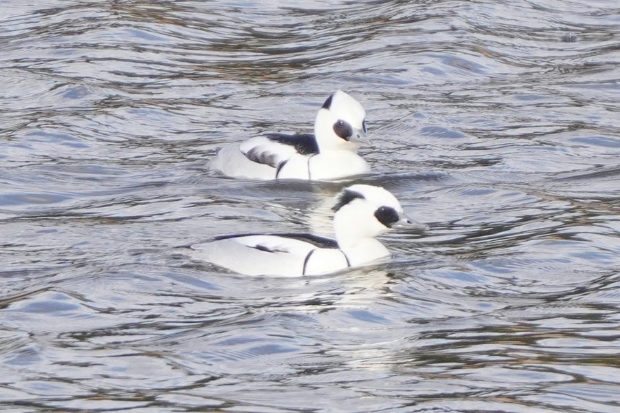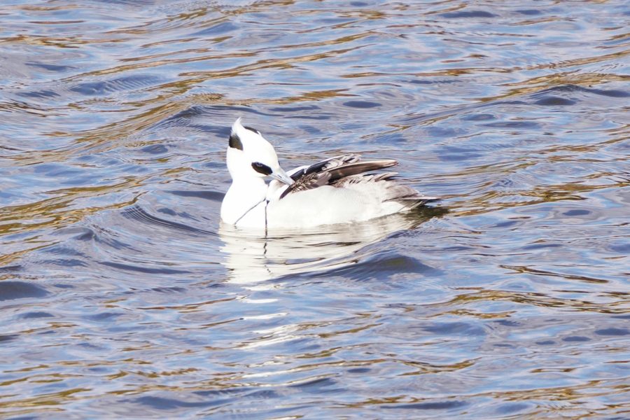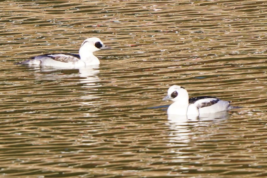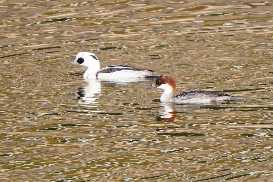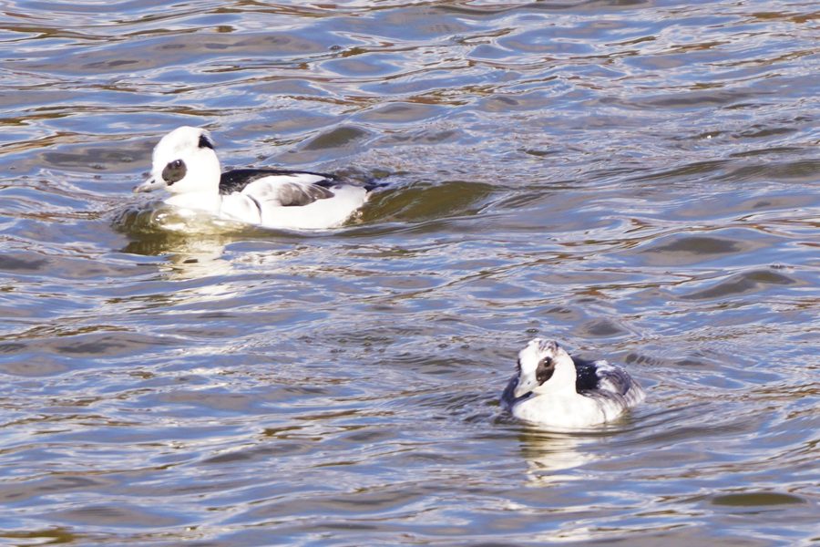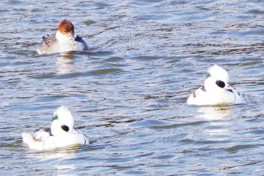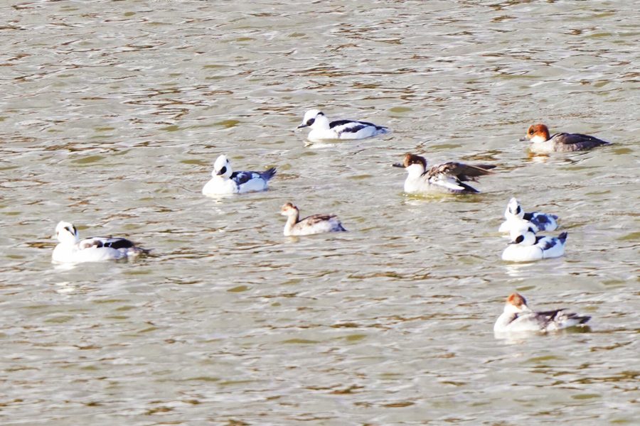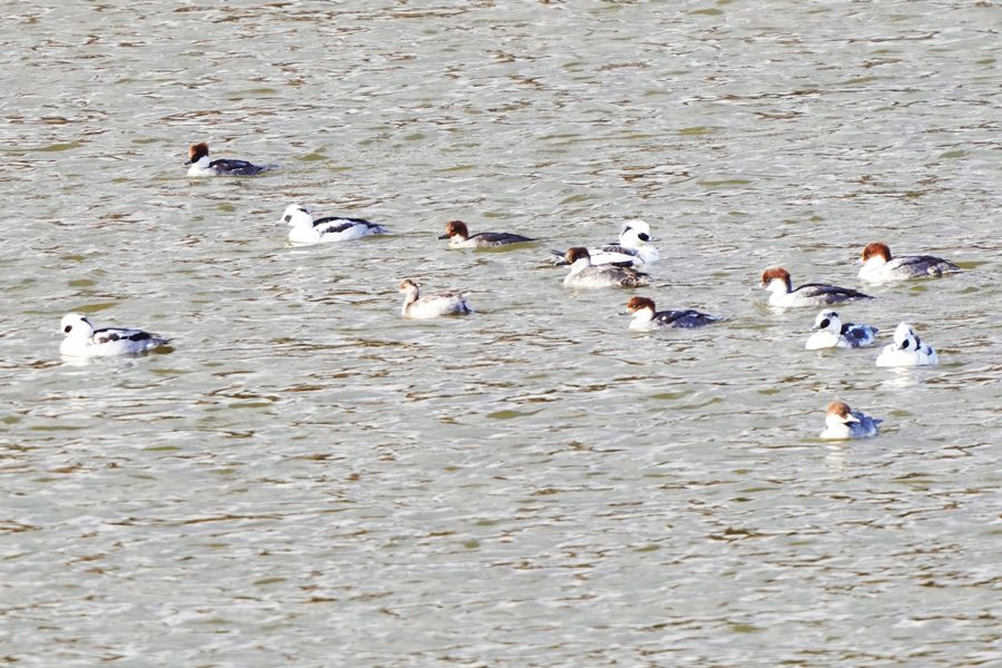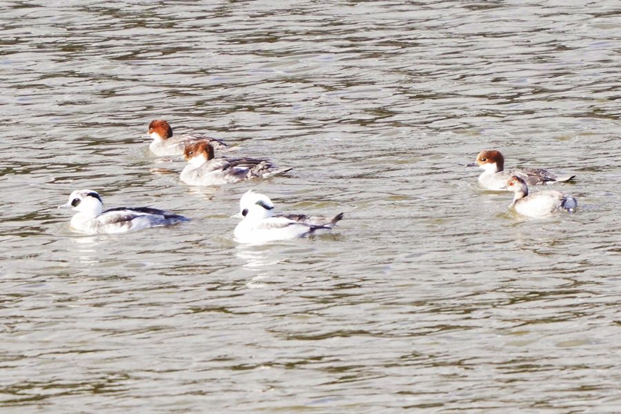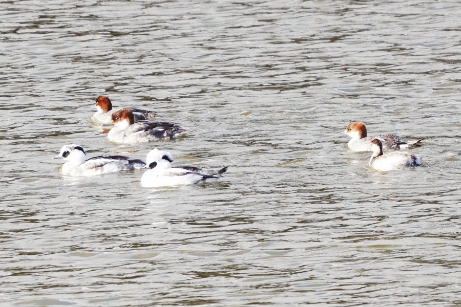 | ミコアイサは数が増えていました。多くが頭部が茶色の雌タイプですが、頭部が白い雄も5羽ほどいました。 |