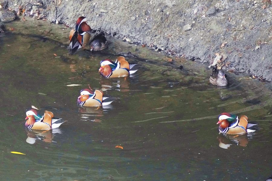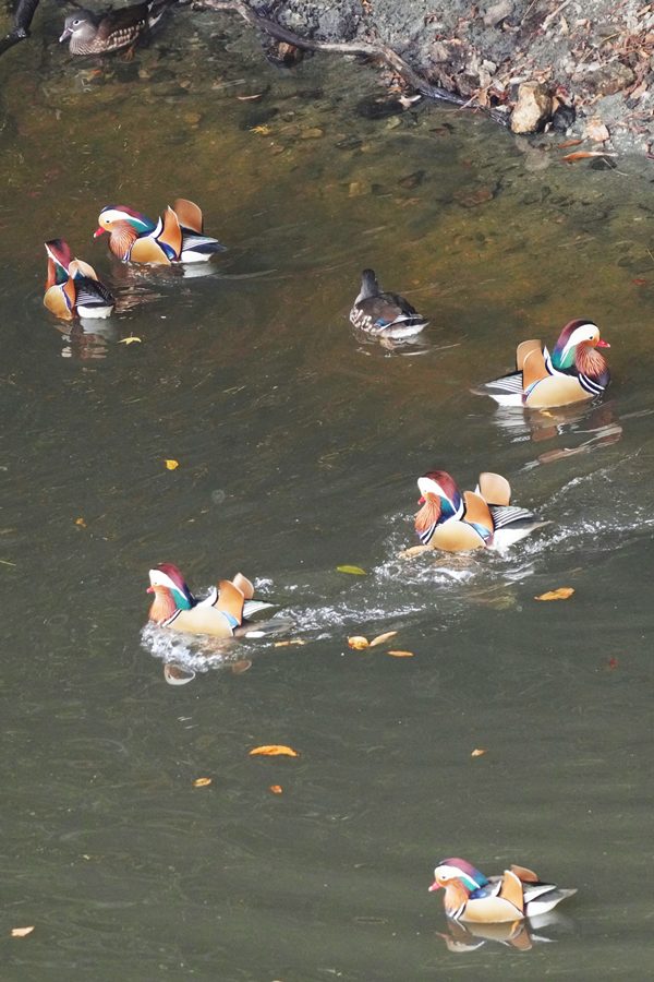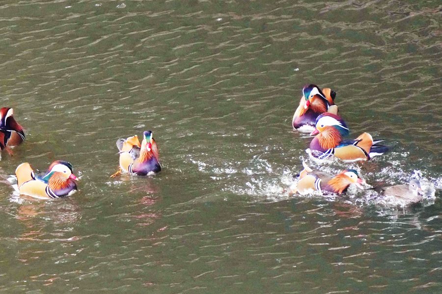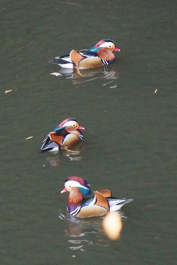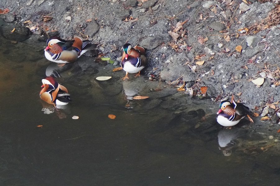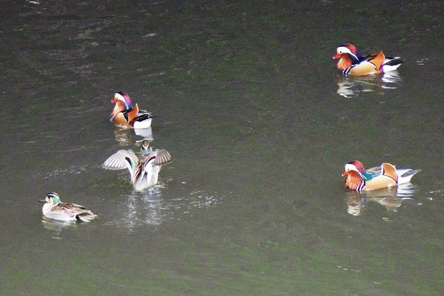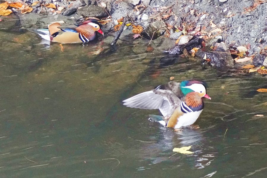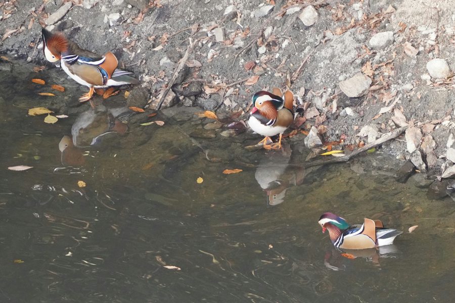 | 前回撮影した14日と同じようにオシドリは岸近くにいて池の真ん中には出てきませんでしたが、岸に上がって休んでいるオシドリは少なく、岸近くで追いかけあいをしたりして、活発に動いていました。 |
