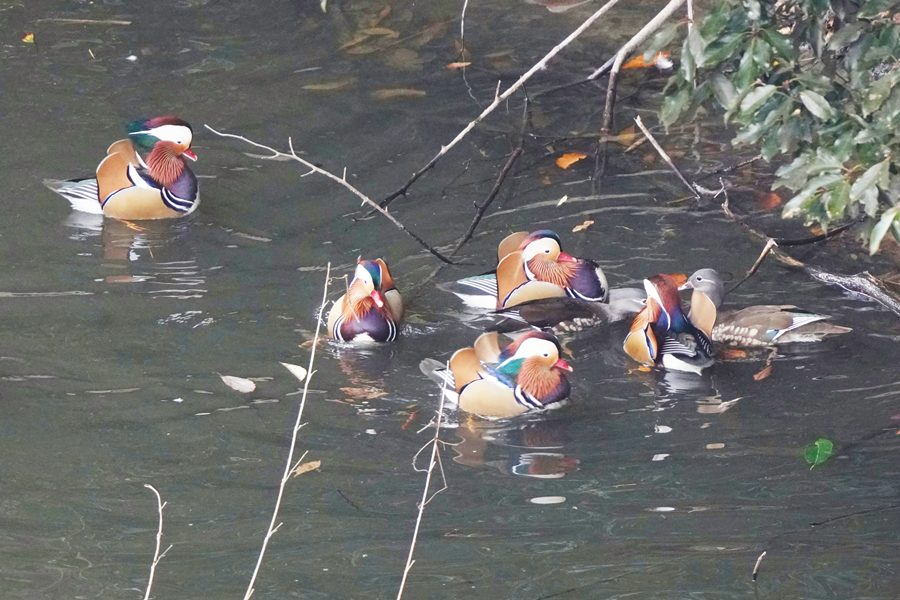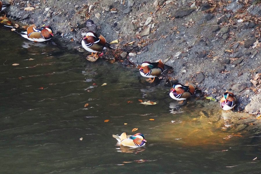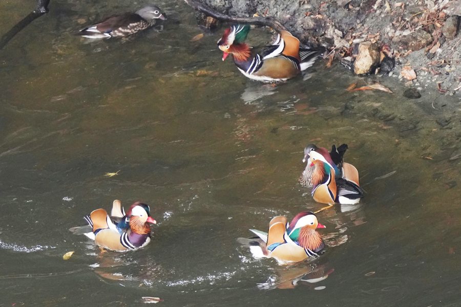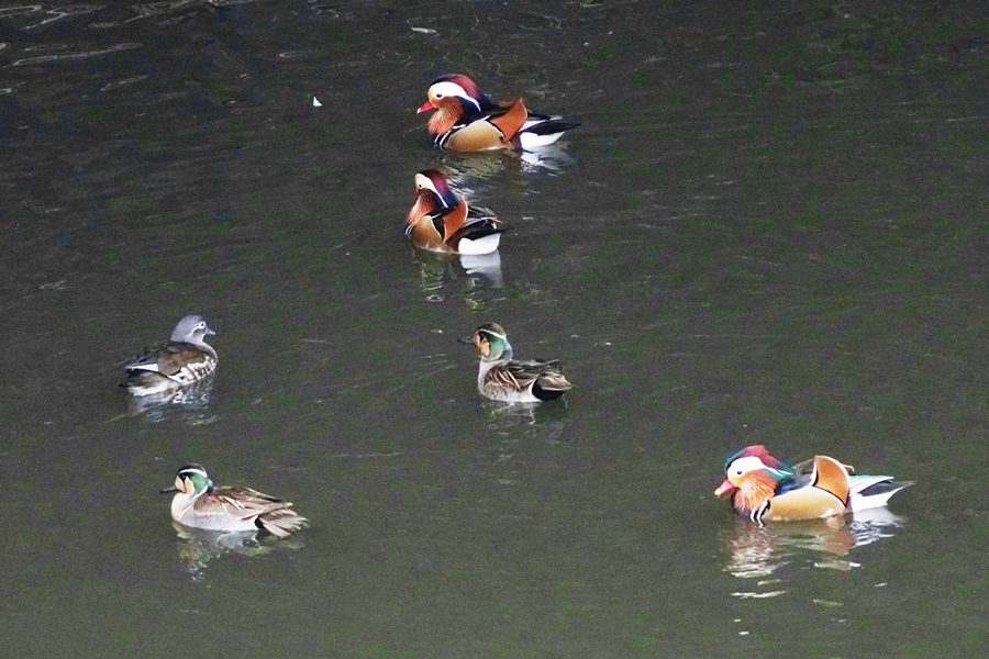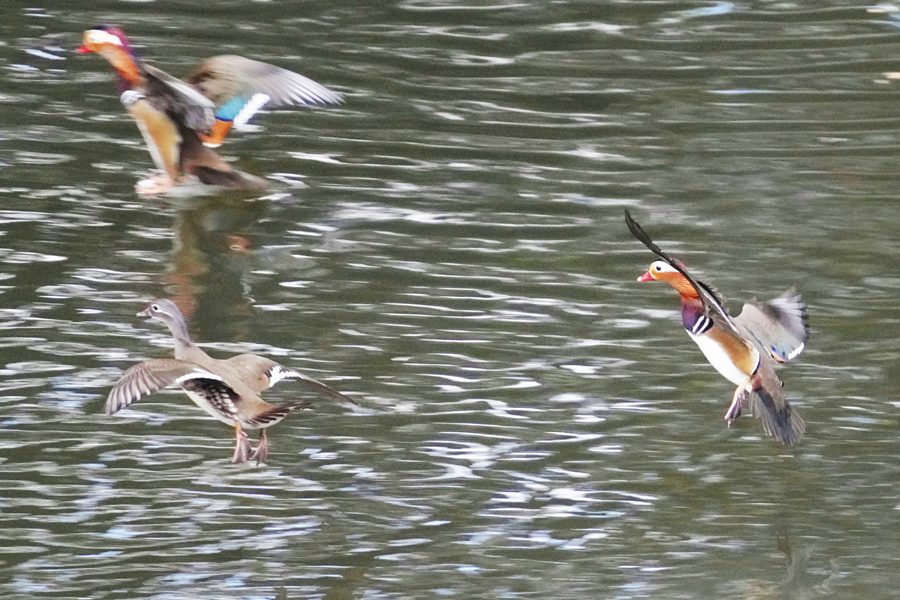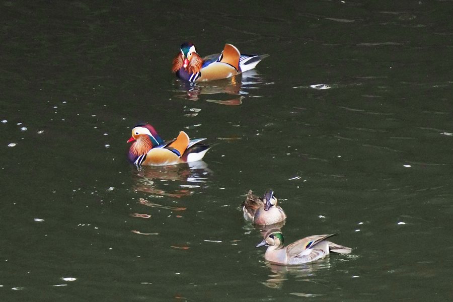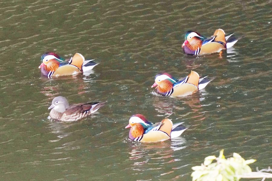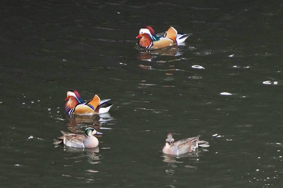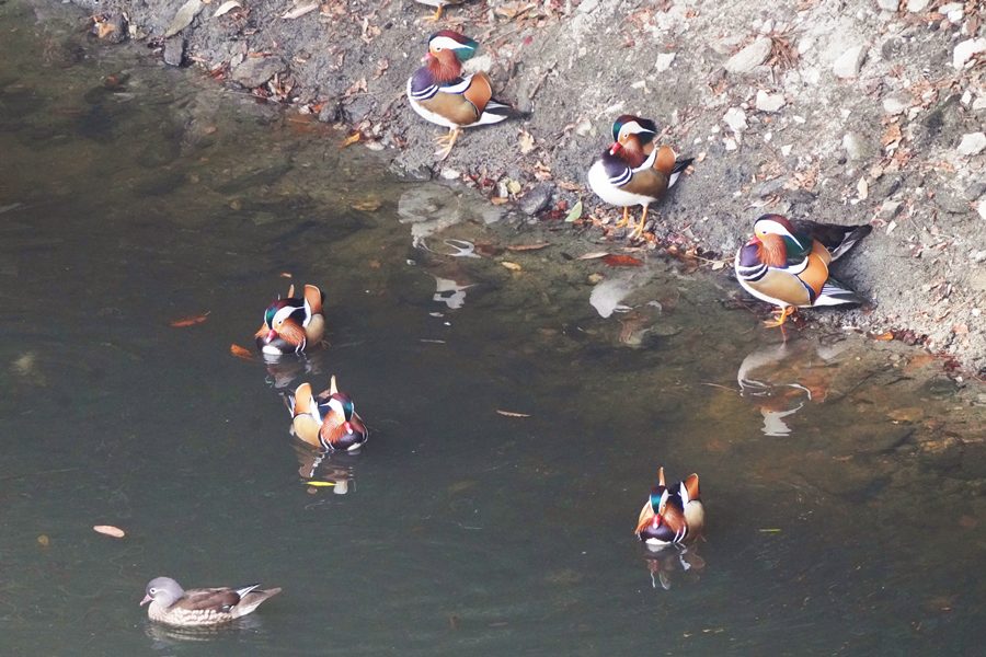 | 前回撮影した14日と同じようにオシドリは岸近くにいて池の真ん中には出てきませんでしたが、岸に上がって休んでいるオシドリは少なく、岸近くで追いかけあいをしたりして、活発に動いていました。 |