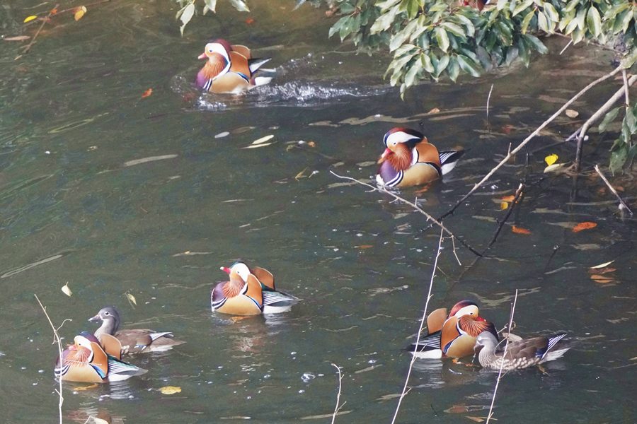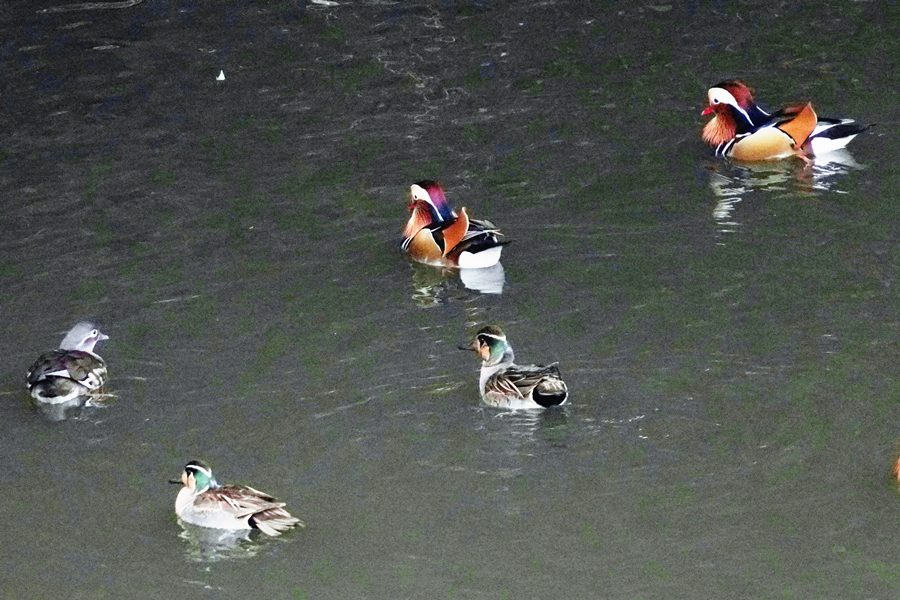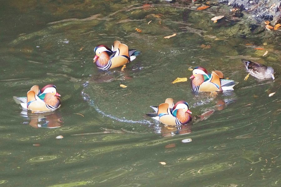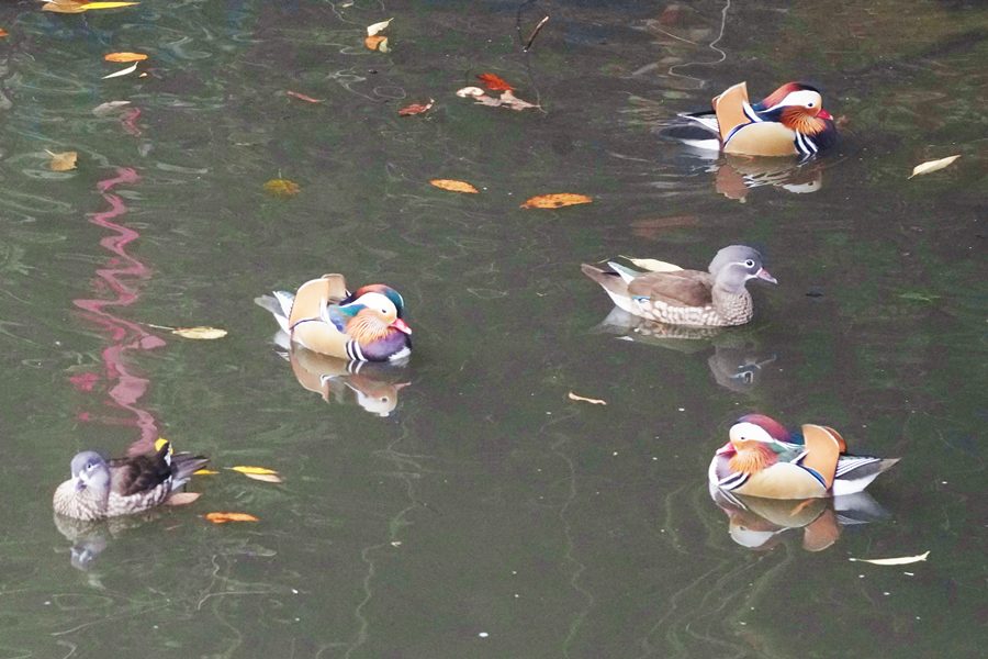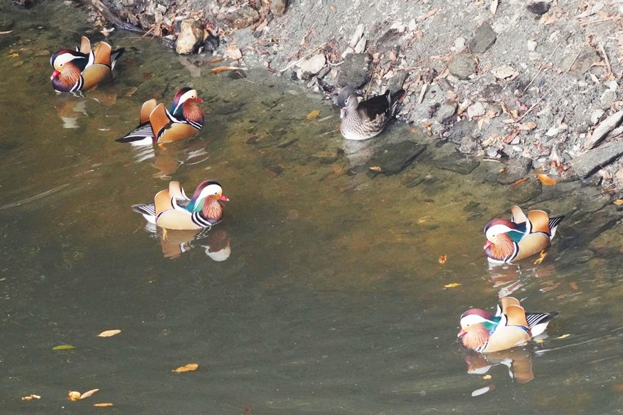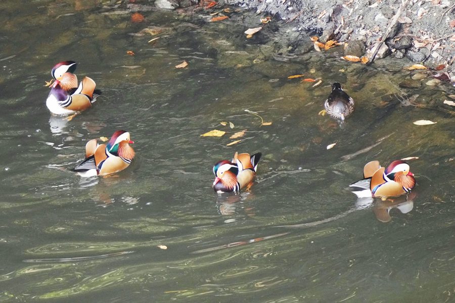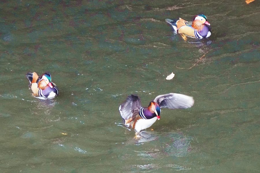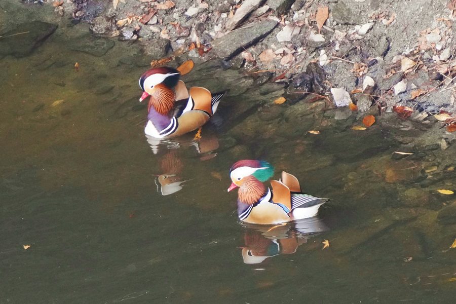 | 前回撮影した14日と同じようにオシドリは岸近くにいて池の真ん中には出てきませんでしたが、岸に上がって休んでいるオシドリは少なく、岸近くで追いかけあいをしたりして、活発に動いていました。 |