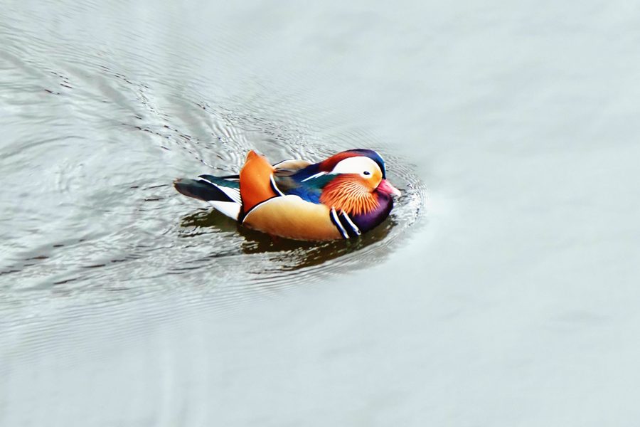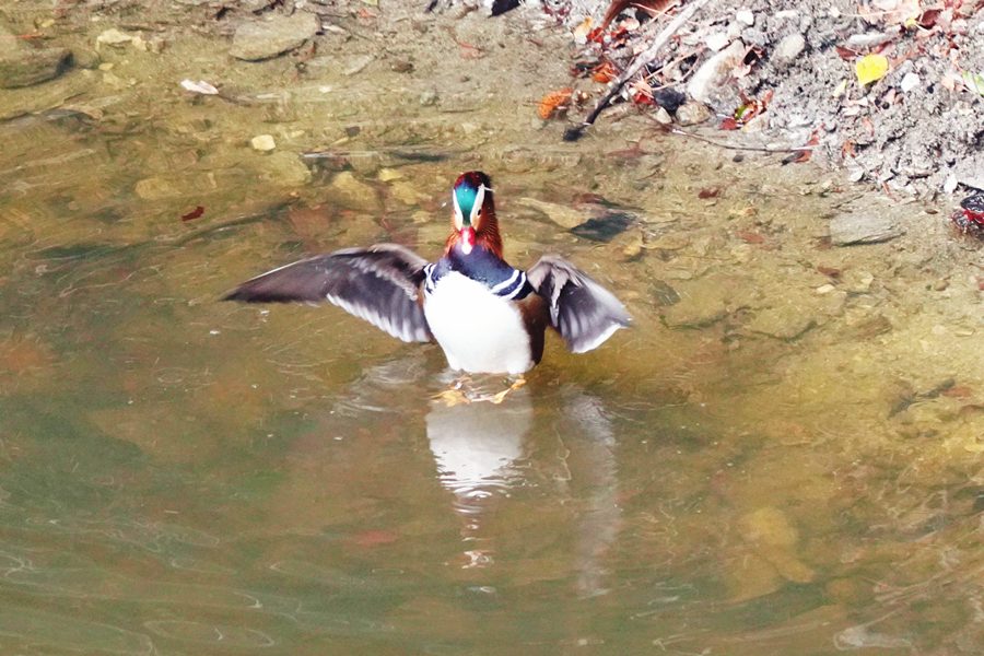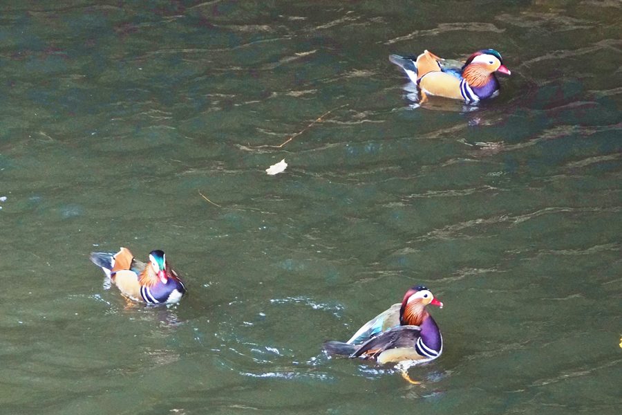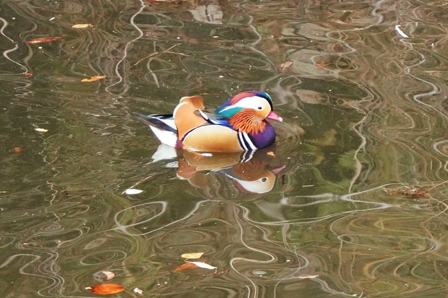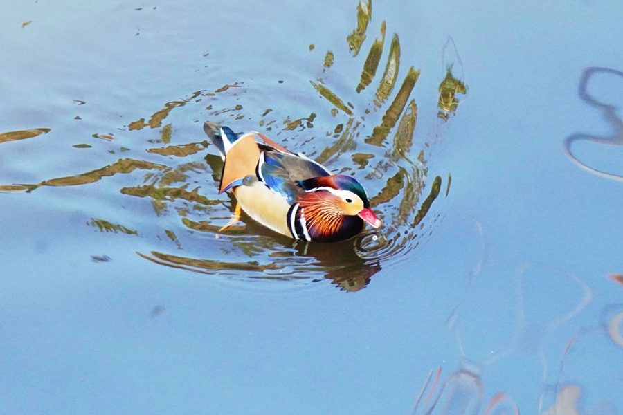 | 良い天気だったのですが、小さな池のため青空が写った水面ではなく、近くの神社の茶色の森が写った水面でしたが、茶色の水面とさざ波が映えて面白い写真になりました。 |