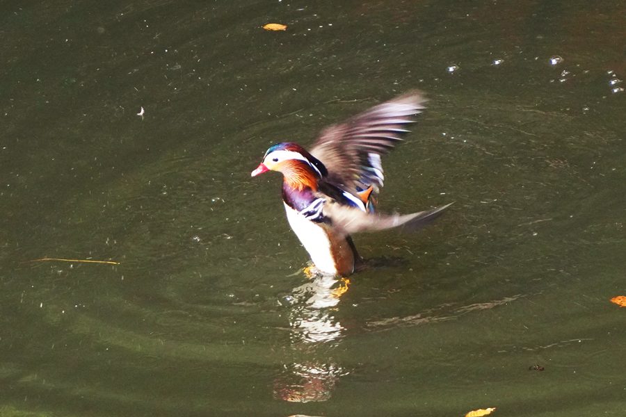| この秋からオシドリは入っているのですが、数が少なくこの池では20羽以上いるところを見たことがありません。この日も1羽・2羽と岸から岸へと移動する姿を撮影しただけでした。 |