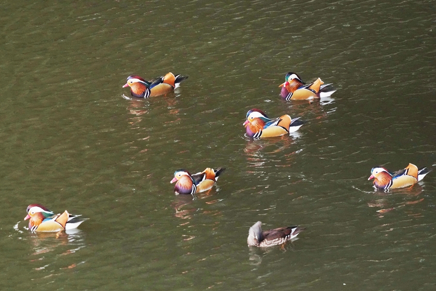 | 山の上の池で14日に撮影したオシドリです。この日は久しぶりにこの池で数が多くいるオシドリを見ました。ただし、ほとんどのオシドリは池の岸で休んでいて動こうとしません。時々数羽が岸を離れるのですが、池の真ん中には出てきたのは1羽のみでした。 |