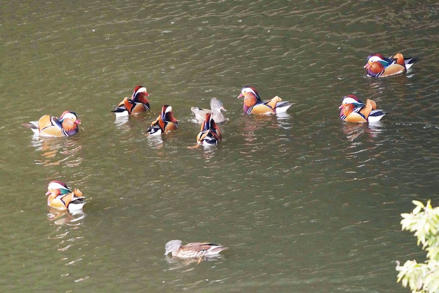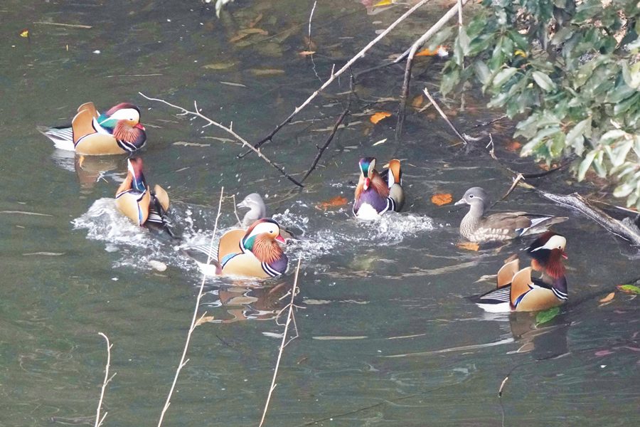 | 向かって右の岸の木の下で群がっていたオシドリの一部が飛び立ち、左の岸近くの陰になった暗い水面に飛び降りました。 |