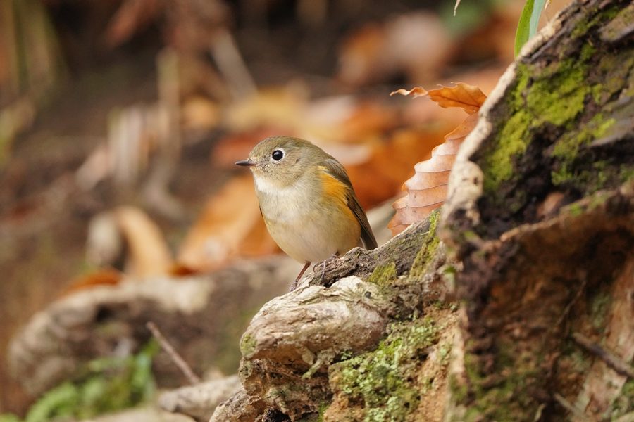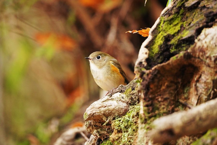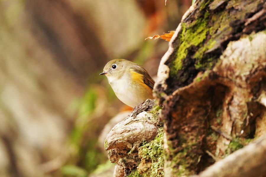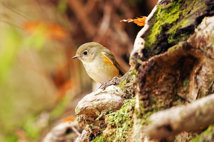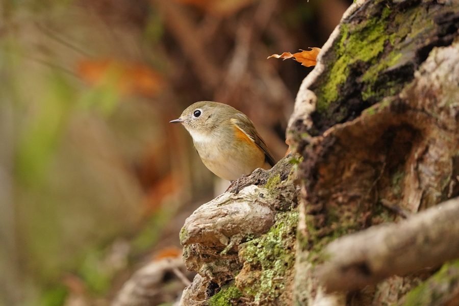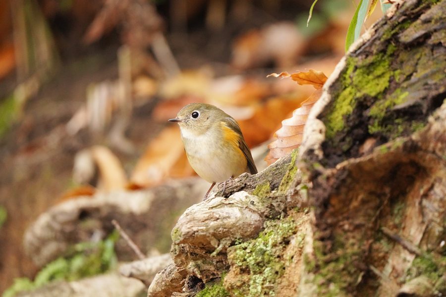 | 12日に撮影したルリビタキ♀です。クロジを撮ろうとこの山に来たのですが、1時間以上待っても姿を見られませんでした。帰ろうとした時ルリビタキ♀がコナラの木の露出し根などに姿を見せました。 |