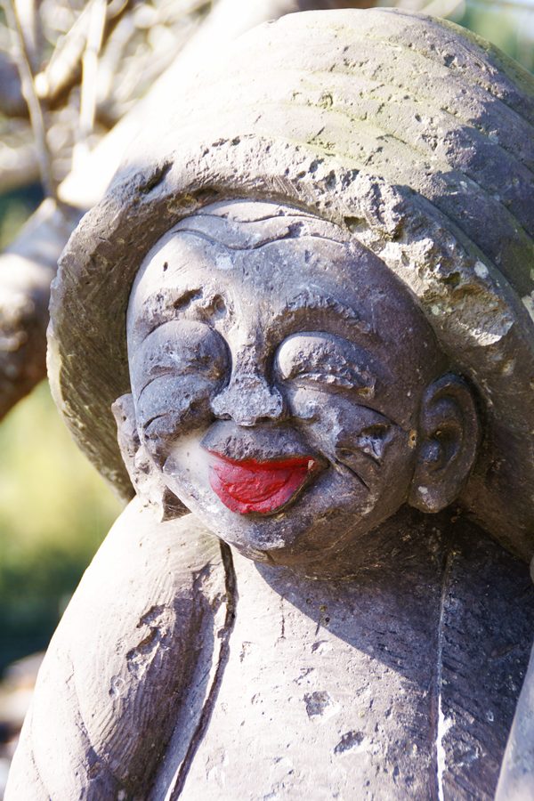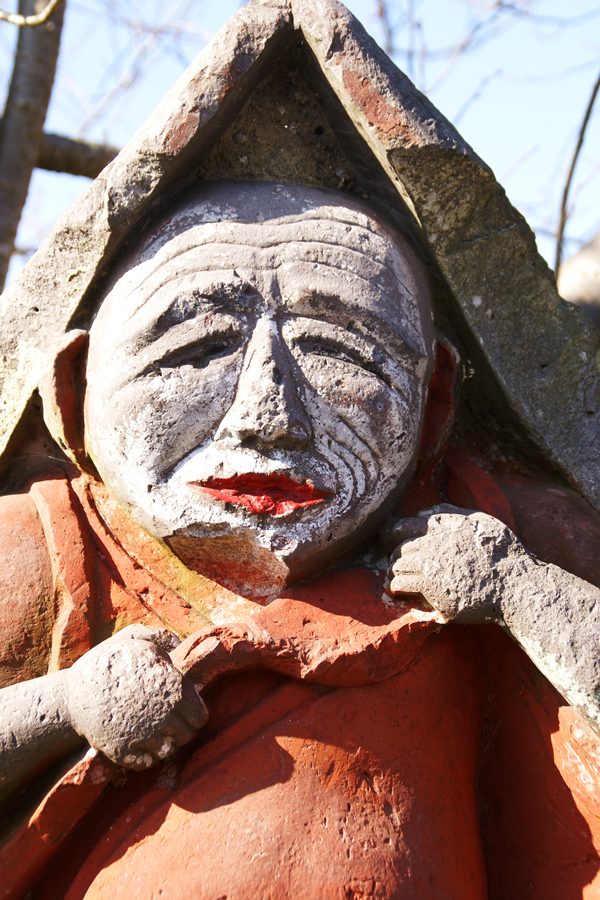 | 向かって右側に立つ田の神像である。像高80㎝の田の舞型の田の神で、「日木山里の田の神」と同じく右手にメシゲを持ち、左手で頭にかぶったシキを押さえて中腰で田の神舞を踊っている。 しかし、「日木山里の田の神」と受ける印象は少し違う。「日木山里の田の神」の笑みの浮かべた顔は写実的で、実際にいる人の好い農夫がいかにも微笑んでいるように見えるのに対して、この田の神の笑みの浮かべた顔は大げさで写実的とは言えない。しかし、この大げさな顔の表情や手の動き、胸や腹を出した姿は可愛らしく、「日木山里の田の神」とまた違った魅力がある。 |