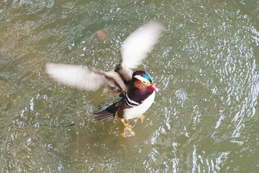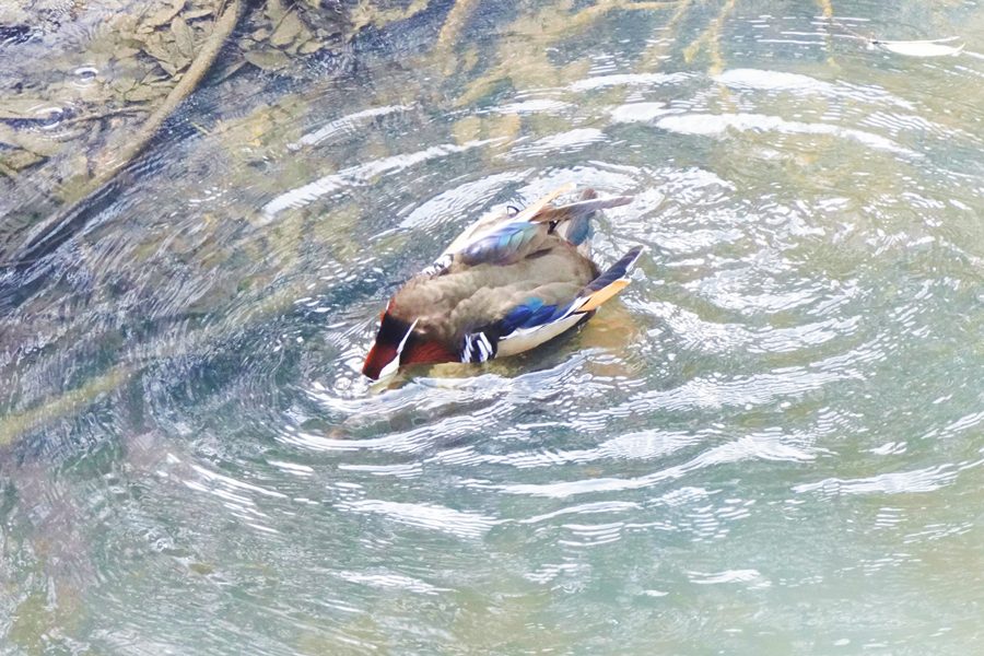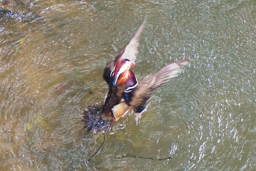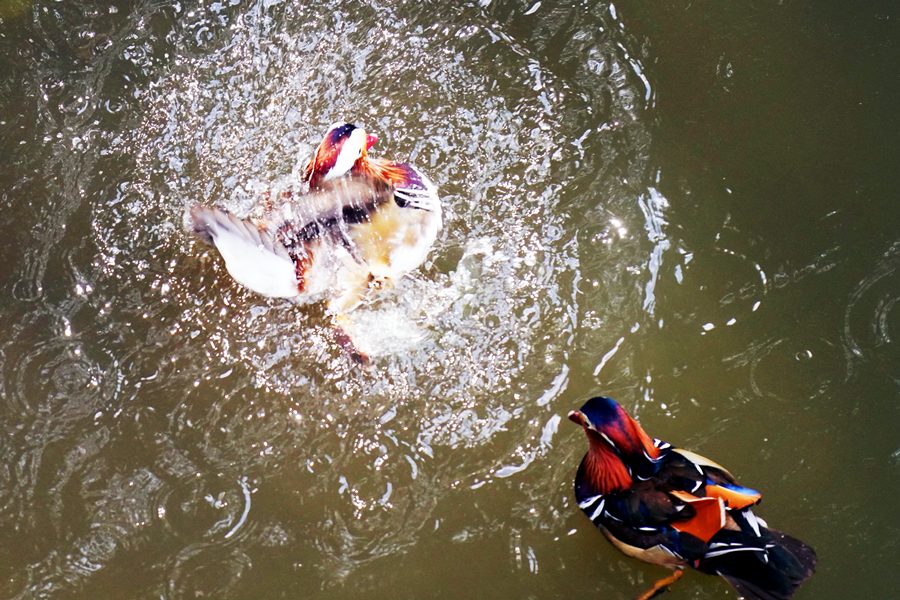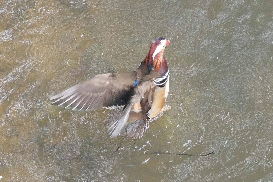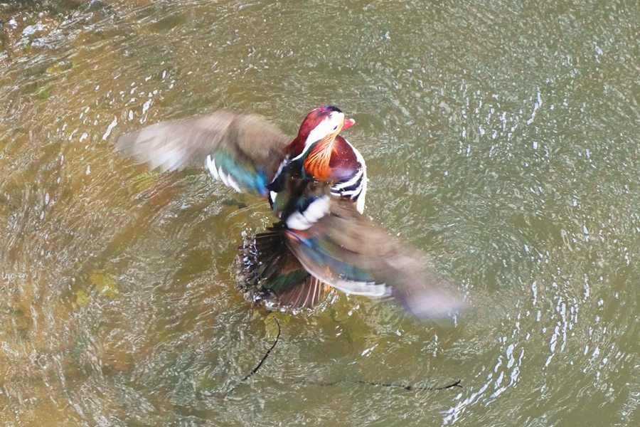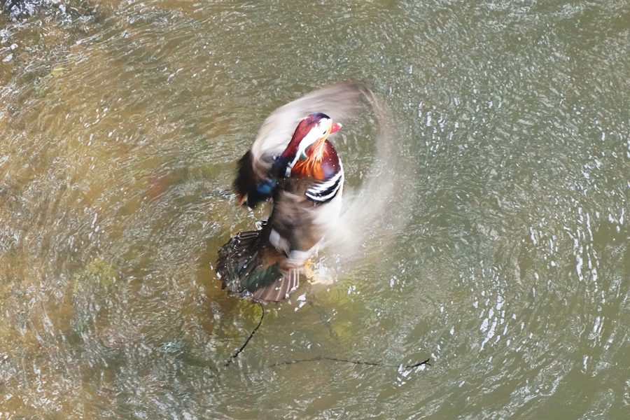 | 橋の下近くの岸近くで数羽のオシドリが競うように水に潜り、浮き上がって羽ばたいたり、水を切るように素早く翼を動かして水浴びをしたりしていました。 |