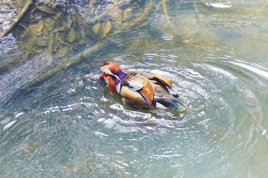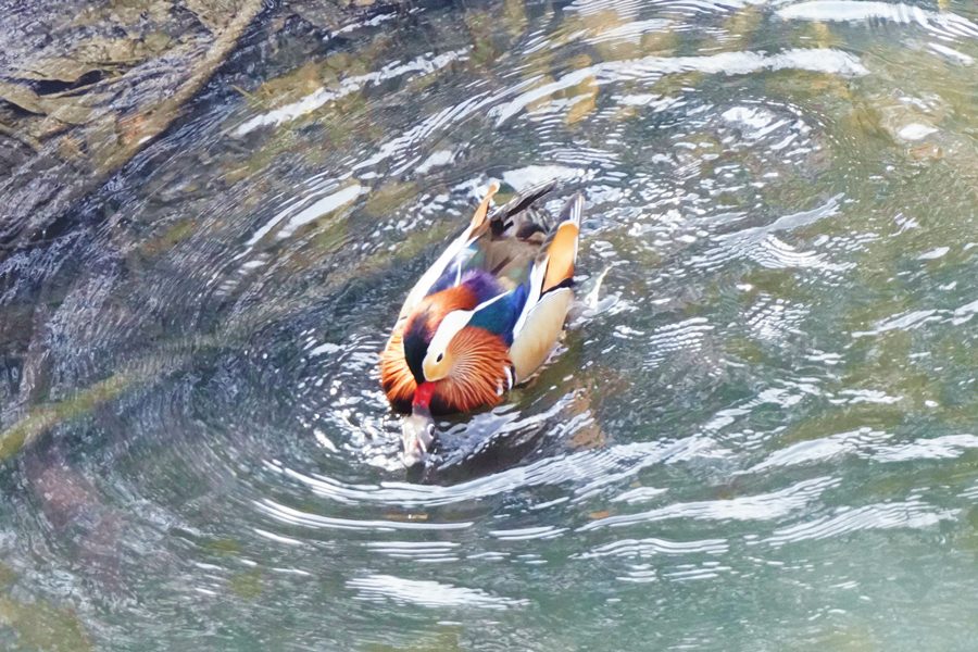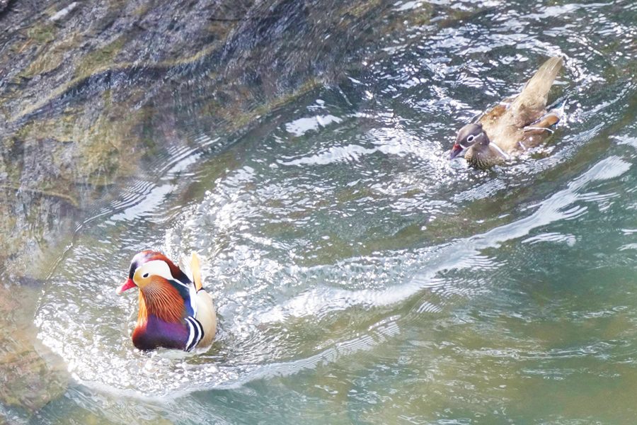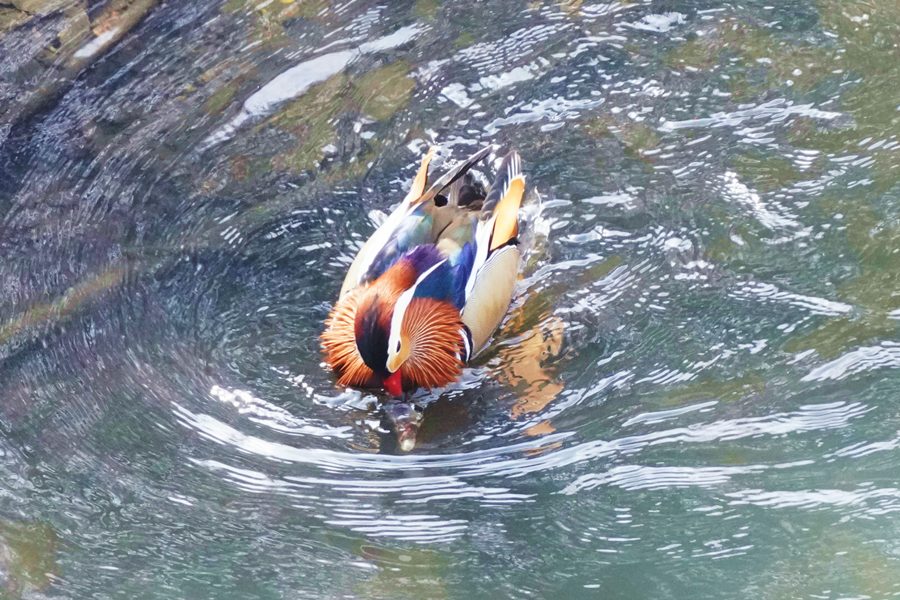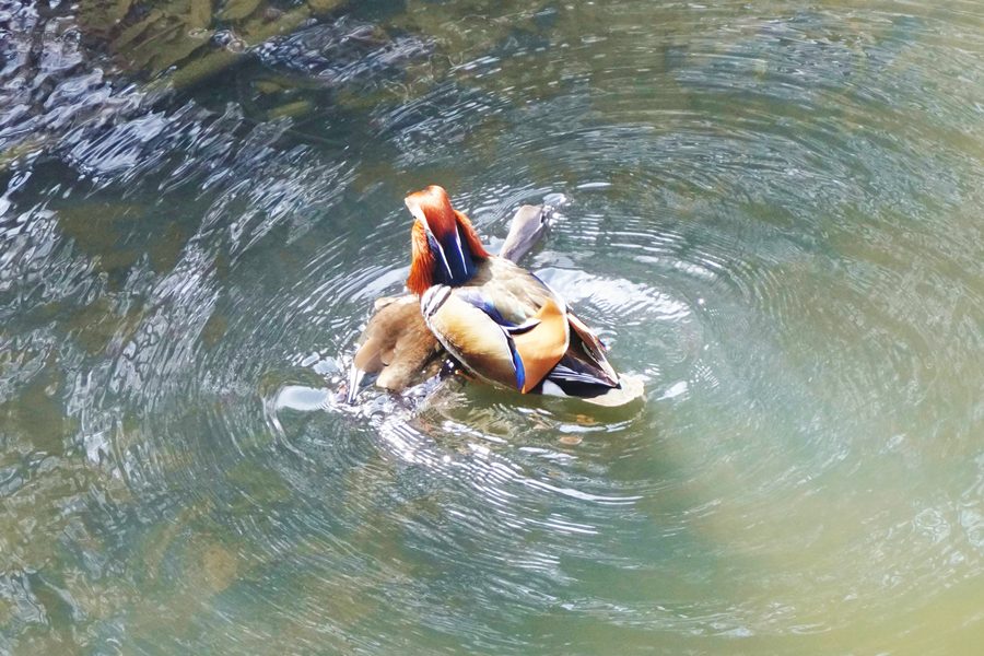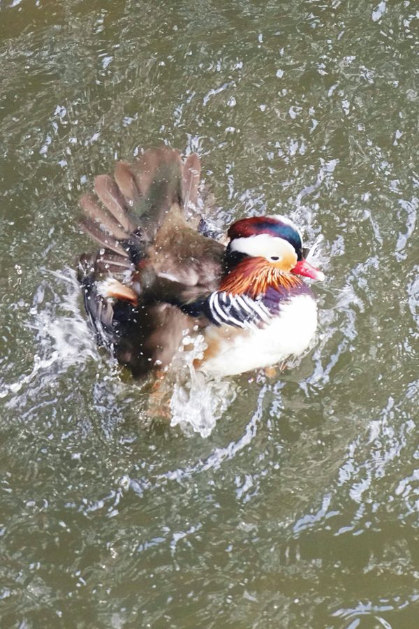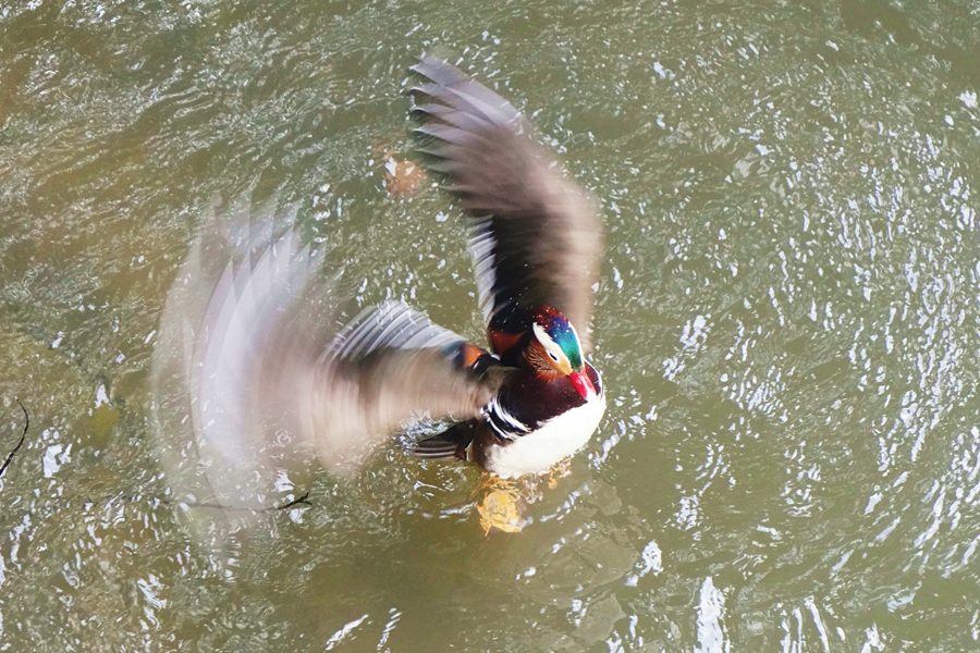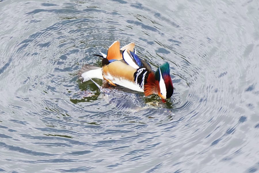 | 橋の下近くの岸近くで数羽のオシドリが競うように水に潜り、浮き上がって羽ばたいたり、水を切るように素早く翼を動かして水浴びをしたりしていました。 |