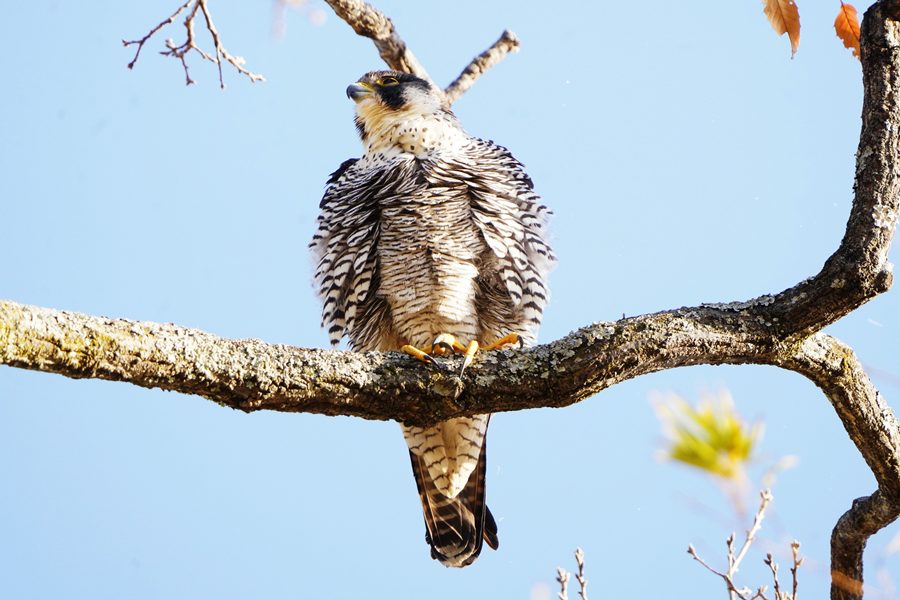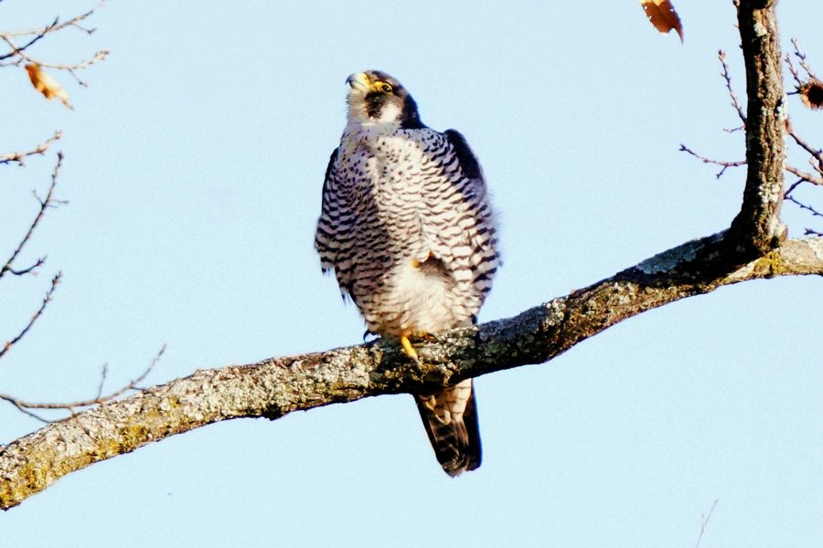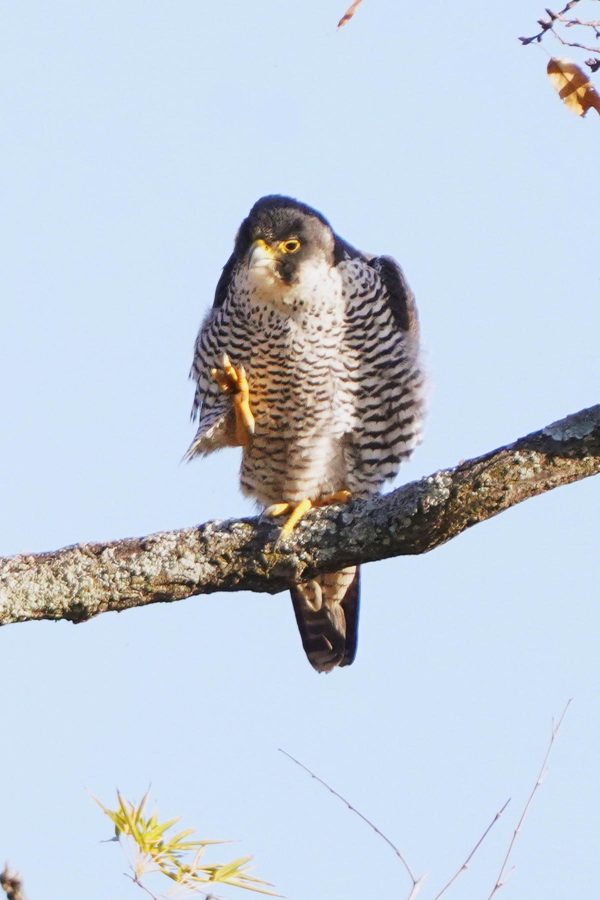 | 11月にハヤブサの水浴びを撮って以来のハヤブサの撮影です。この日も水浴びをしていたそうですが、訪れた時はハヤブサは池畔の木に止まって動きません。この木は去年もハヤブサ(同じ固体と思われる幼鳥)がよくとまっていた木です。 |