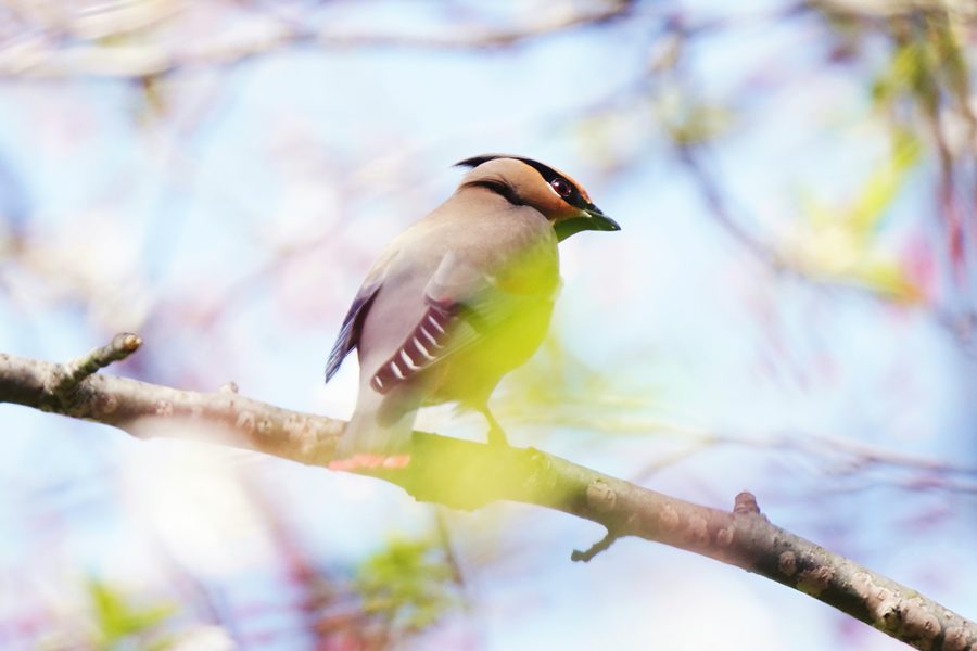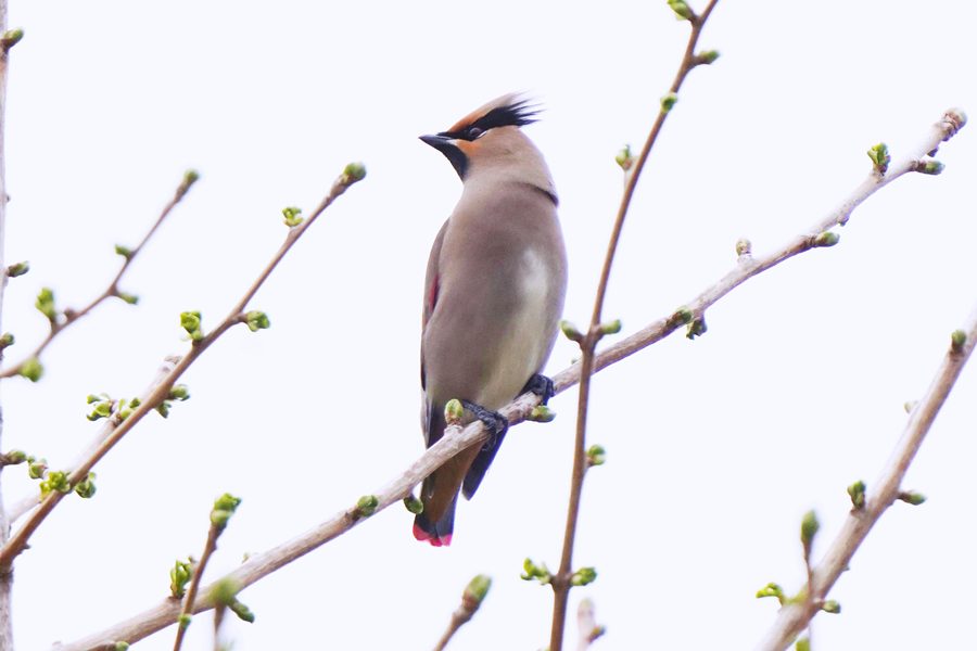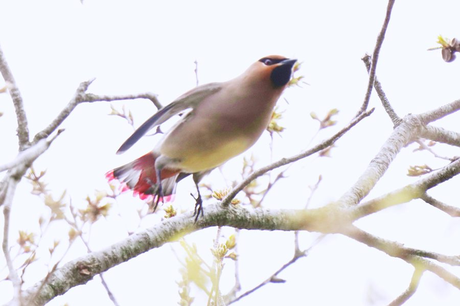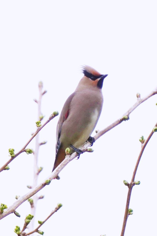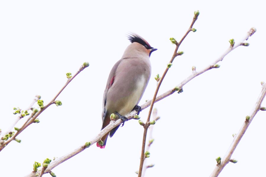| 山の上の池のオシドリがそろそろ旅立つ頃なのでオシドリを撮ろうと地元の山へ行きました。オシドリのいる池に行くと池のそばの高い木にムクドリよりやや小さい大きさの鳥が10羽ほどとまっていました。カメラを向けると大半が飛び立ちましたが、2羽残っていてシャッターを切りました。モニター画面で確かめてみるとヒレンジャクでした。久振りのヒレンジャクです。 |