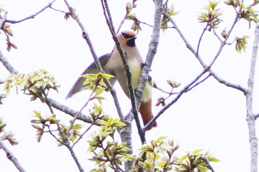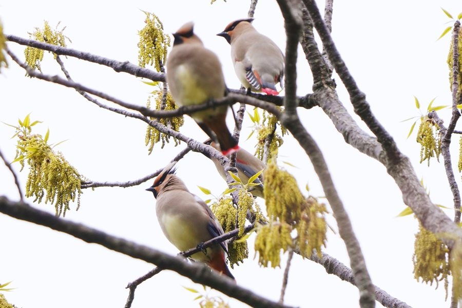 | 飛び立った先は少し離れたより高い木です。そこには10羽以上のヒレンジャクがいました。ほとんど枝被りで遠くてよい写真は撮れませんでした。 |
