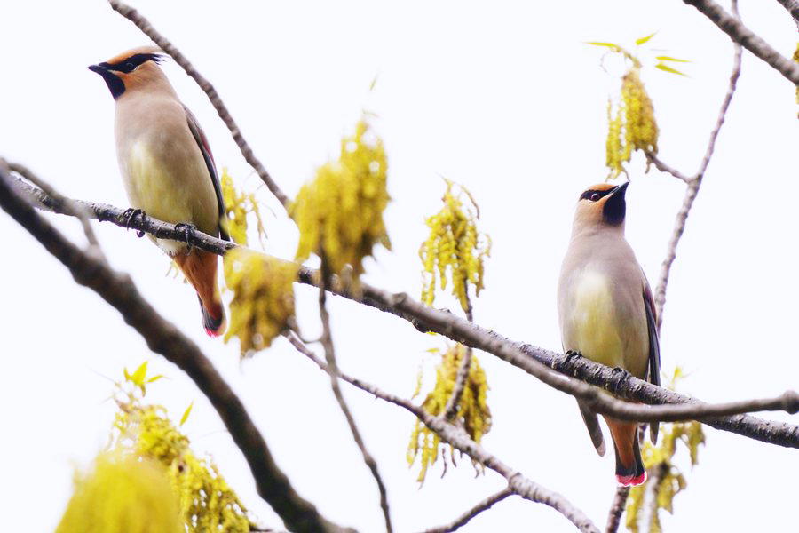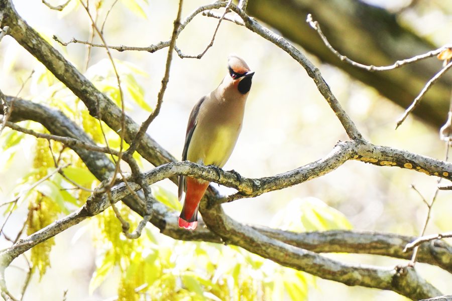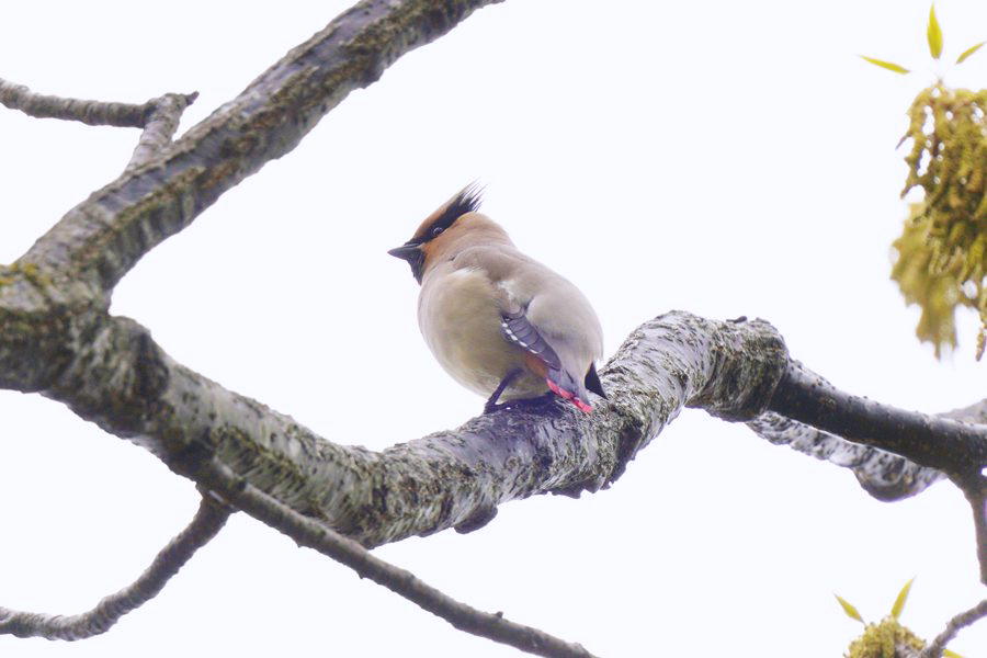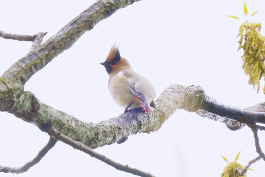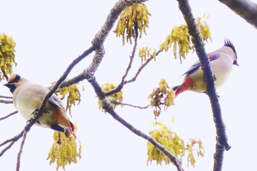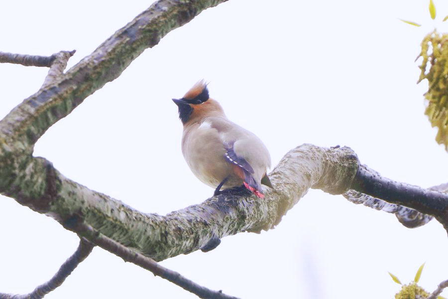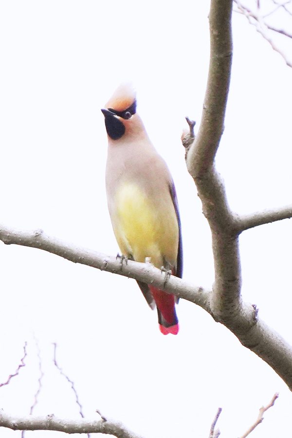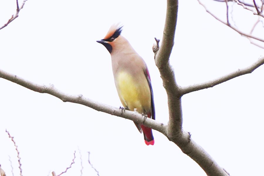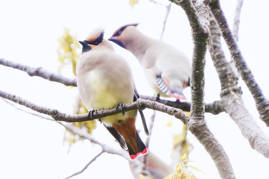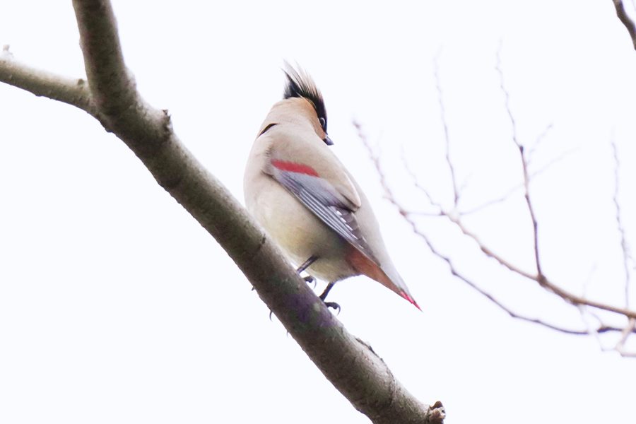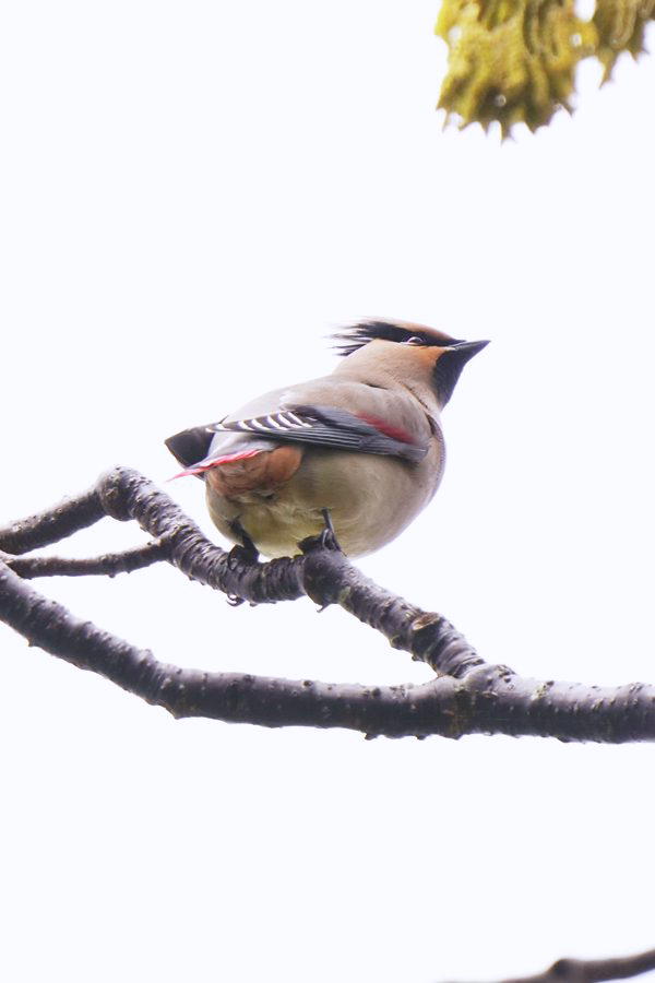 | 飛び去った方向へヒレンジャクを探しに行きました。めどを付けていた展望台付近に行ってみるとヒレンジャクの群れがいました。カメラを向けると大半は飛び立ったのですが、この時も2羽残っていて撮影できました。 |