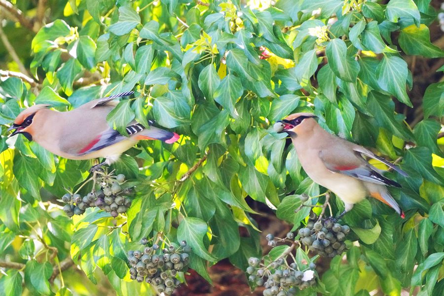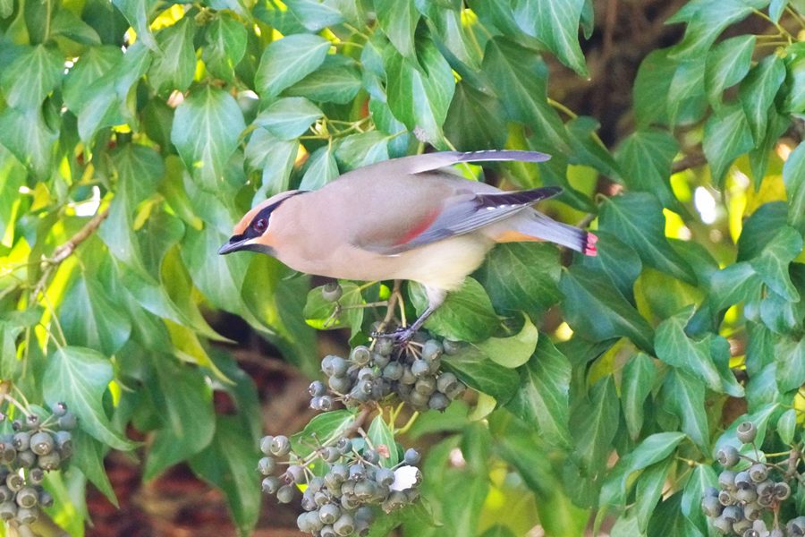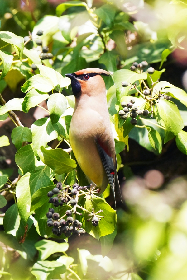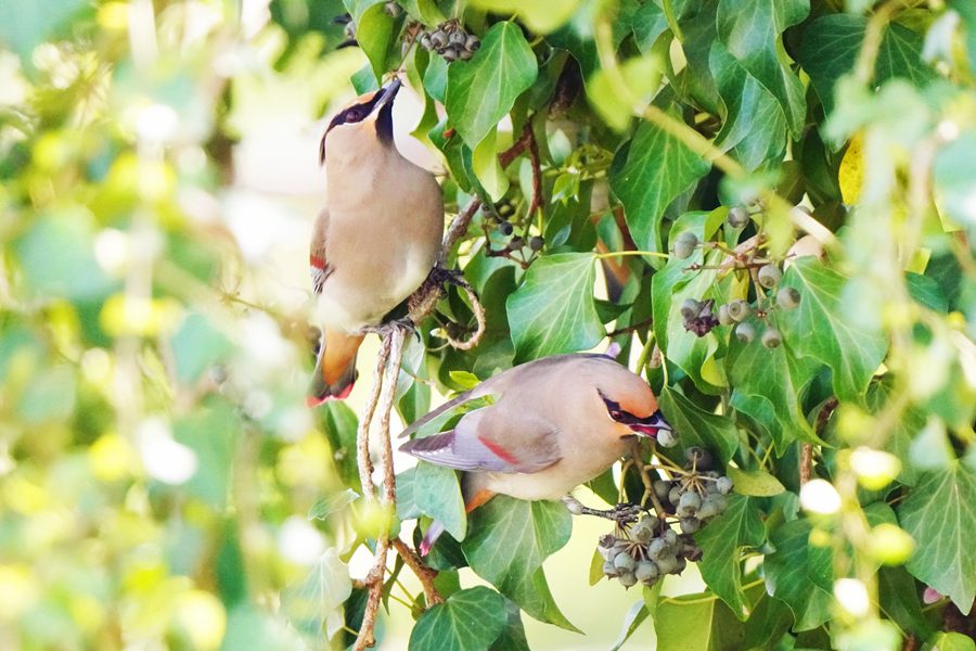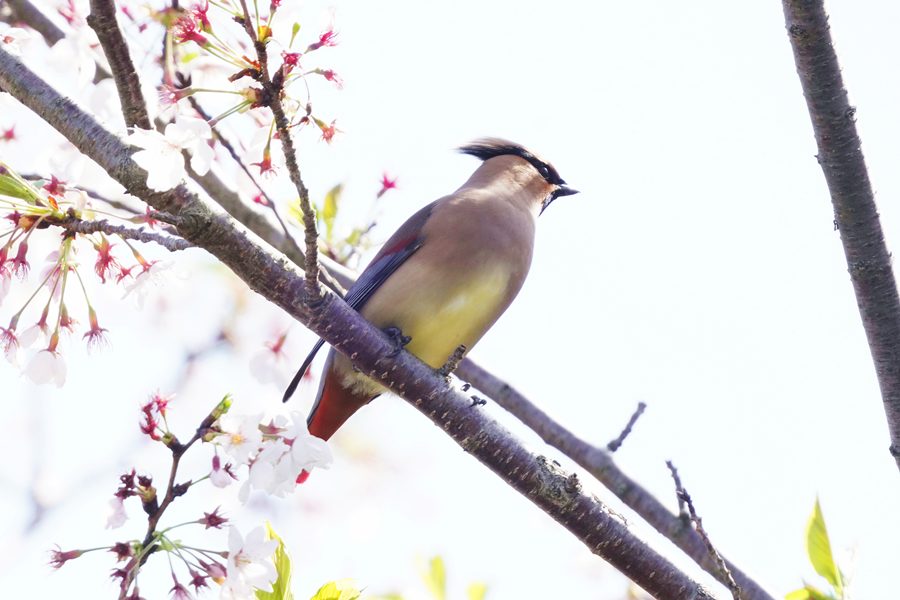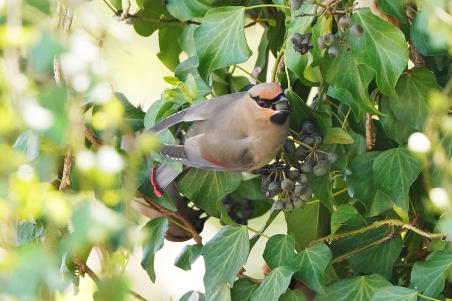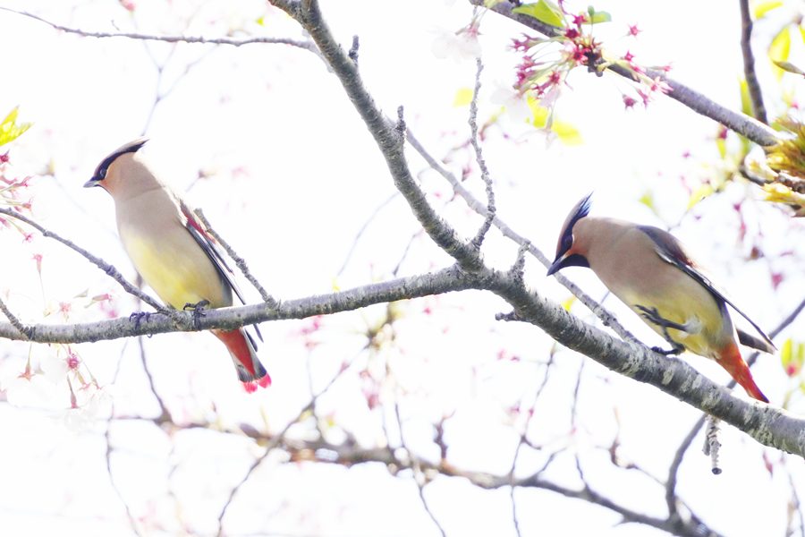 | ヒレンジャクを撮影した翌日は雨で野鳥撮影には行けず、この日は満を持してヒレンジャクの撮影に向かいました。しかし、ヒレンジャクはいませんでした。そこで、3年前にヒレンジャクを撮影した数キロ離れた山の上の公園の桜園に行きました。すると高い木の上にいるヒレンジャクを見つけました。ただ高すぎて遠く、枝かぶりでまともな写真になりませんでした。 その時3年前にキズタ(木蔦)の実を食べにくるヒレンジャクを撮影したことを思い出して、同じ場所に向かいました。すると3年前と同じくヒレンジャクの群れがキズタとキズタの絡まった桜の木にいるのを見つけ、ヒレンジャクを近くで撮影できました。 |